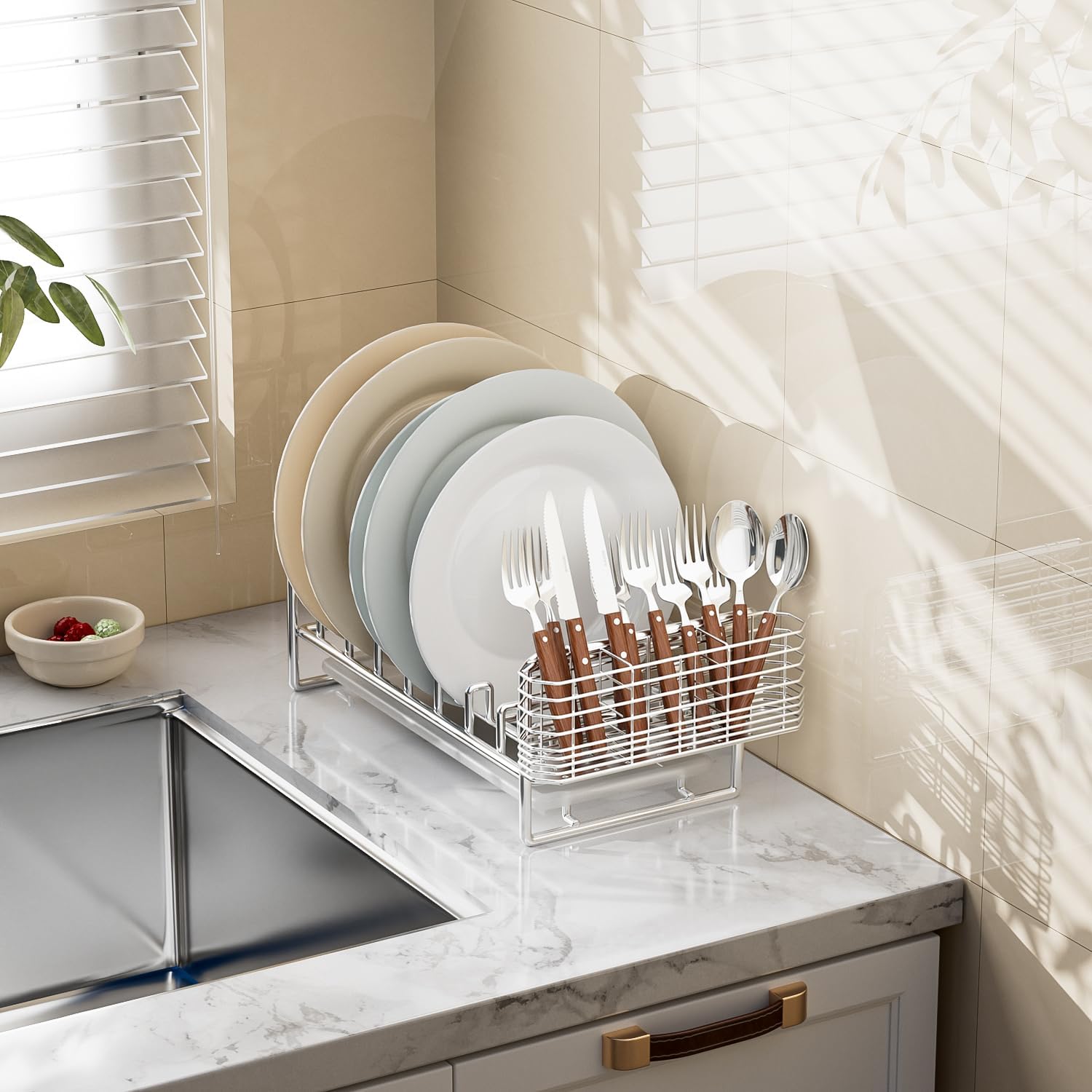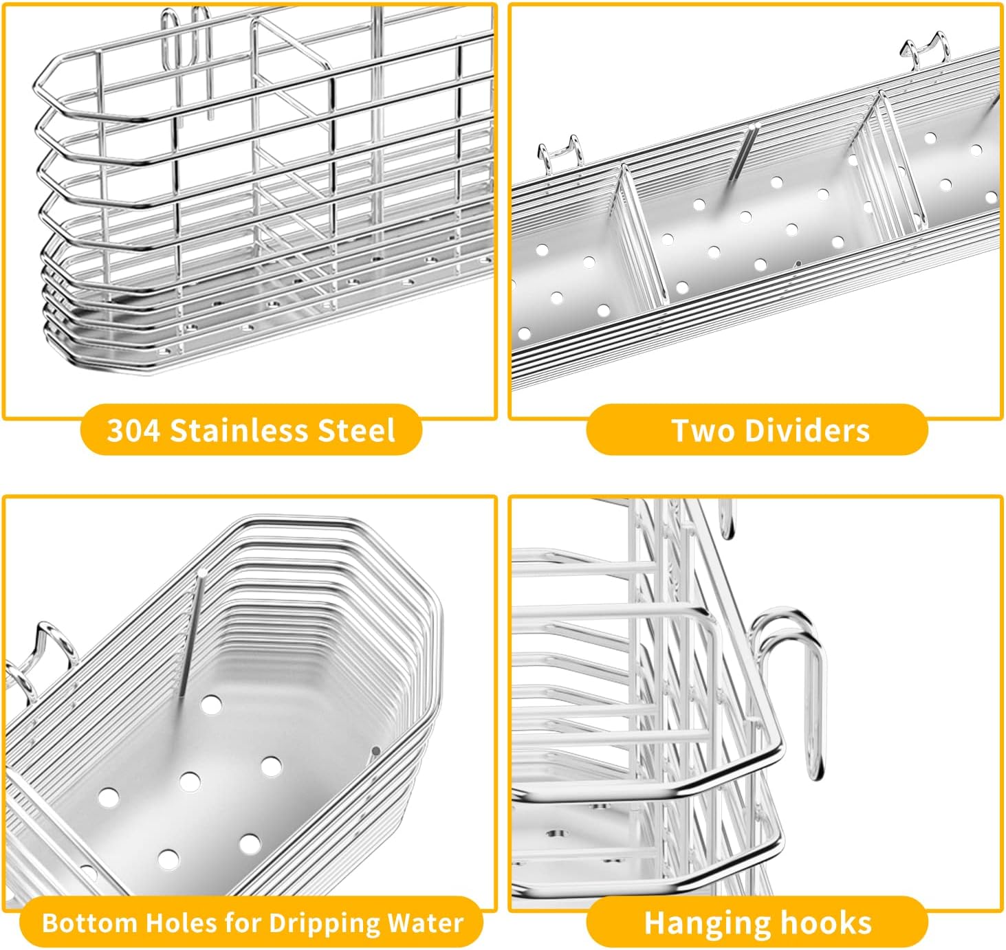 - √ 【Keep your Silverware well-organized 】304 Stainless steel drying basket holds utensils, such as spoons, forks and knives where you need them. Keep countertops clear, no more mess around the sink.