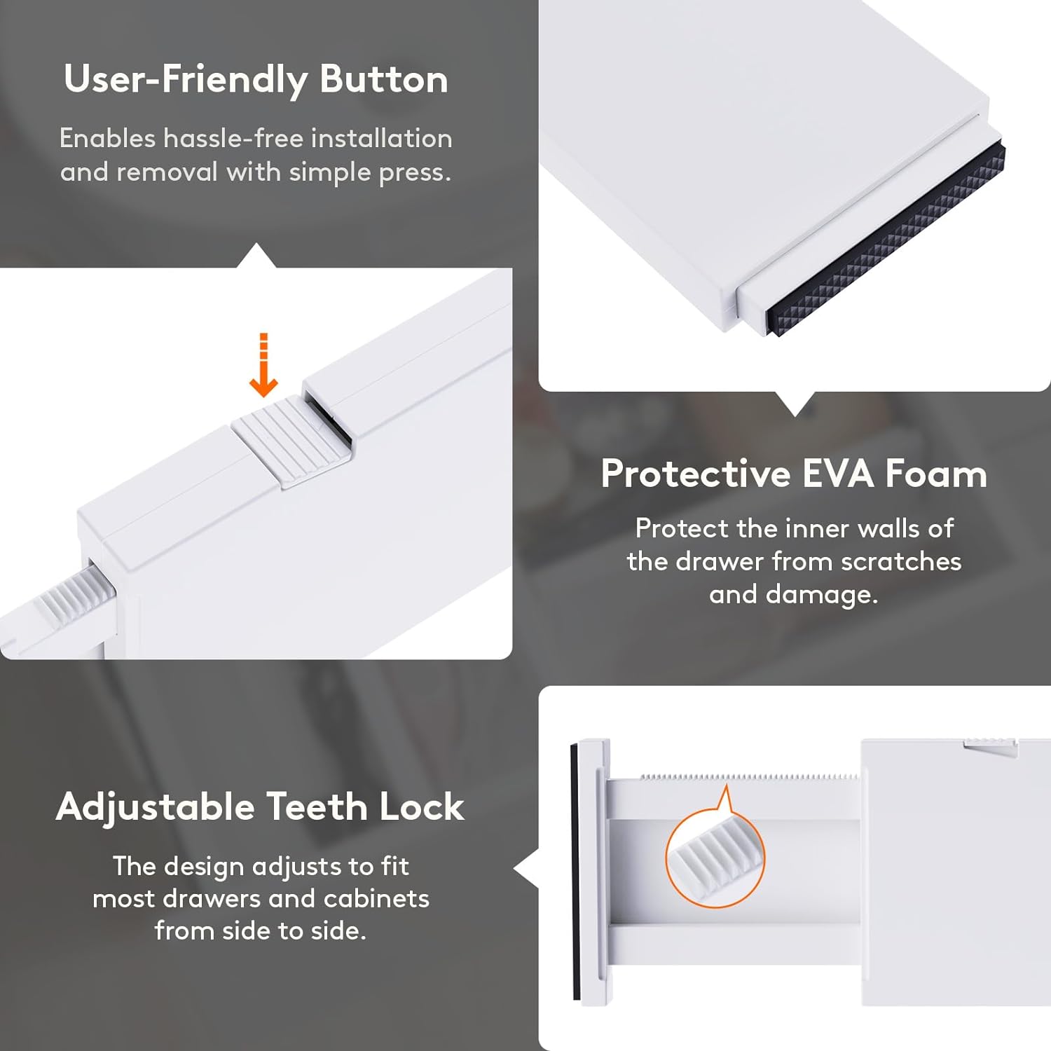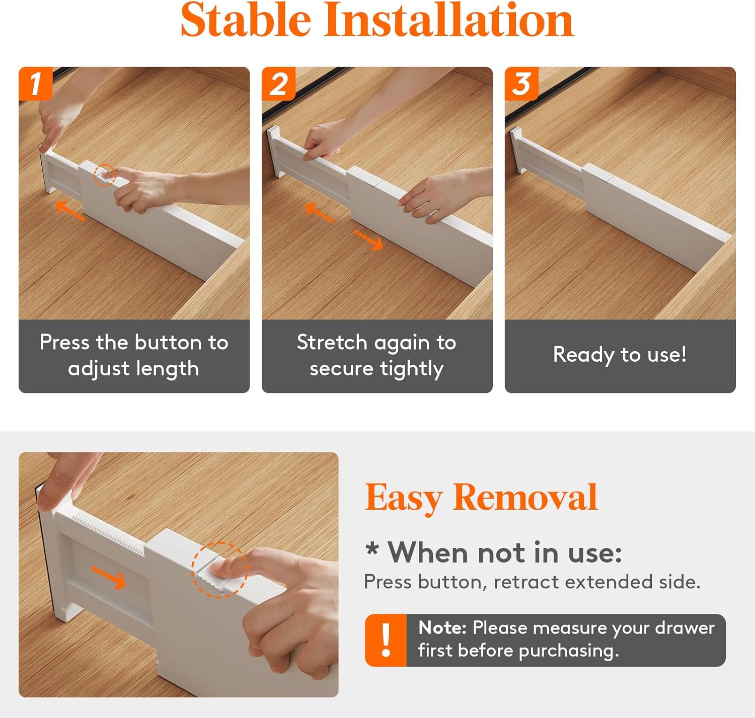 - Stable Installation: Simply press the top button to adjust the length before placing it. After placing, secure it tightly by stretching it out again. The strong spring tension ensures that each dresser organizer stays securely upright. To retract, press the button and push in the stretched side.