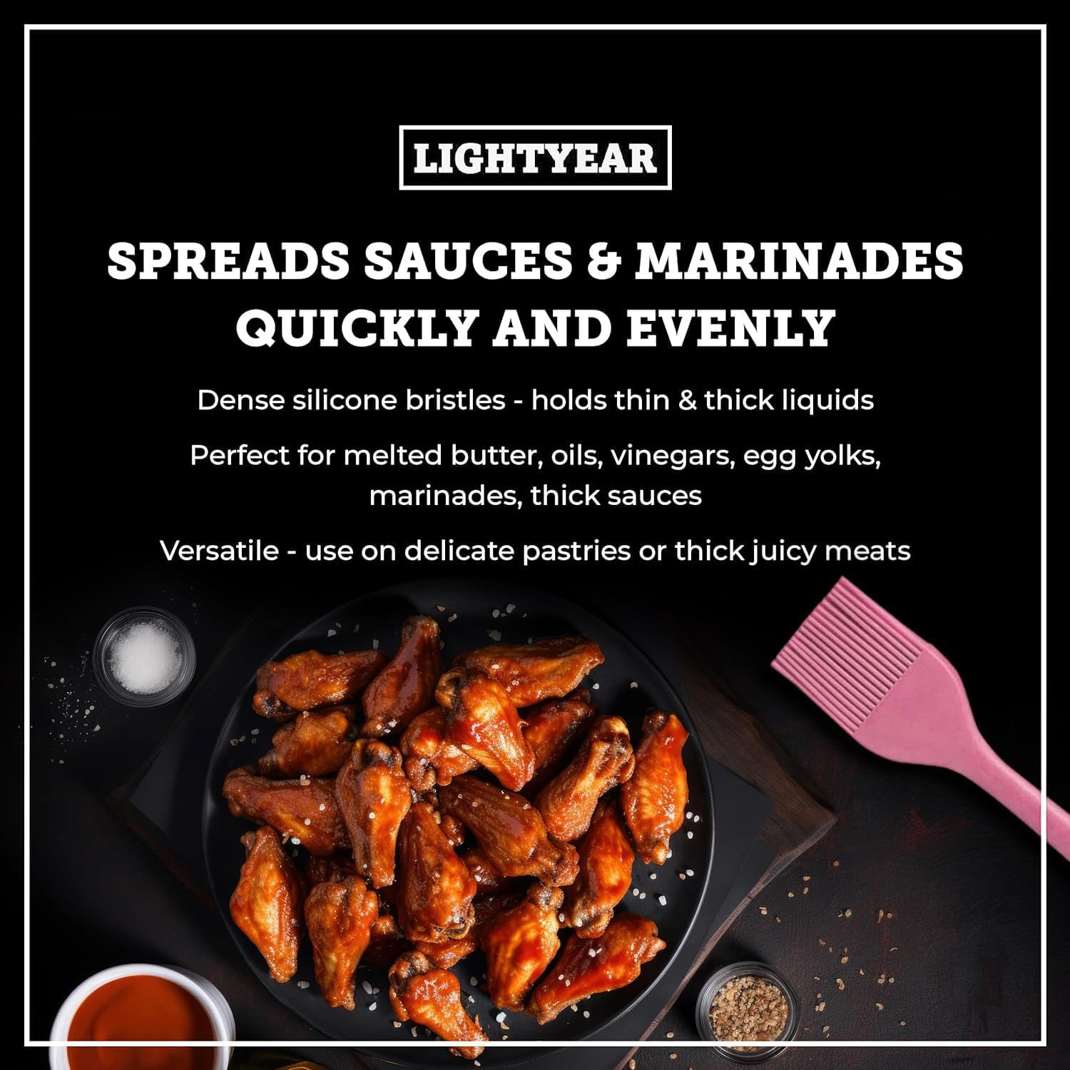 - [ SPREADS SAUCES AND MARINADES QUICKLY AND EVENLY ] Lightyear’s dense silicone bristles absorb both thick and thin liquids for more effective basting. This means you get an even spread of your marinade, ensuring that every inch of your food is infused with flavour. Perfect for melted butter, oils, vinegars, egg yolks, and juicy meat marinade.