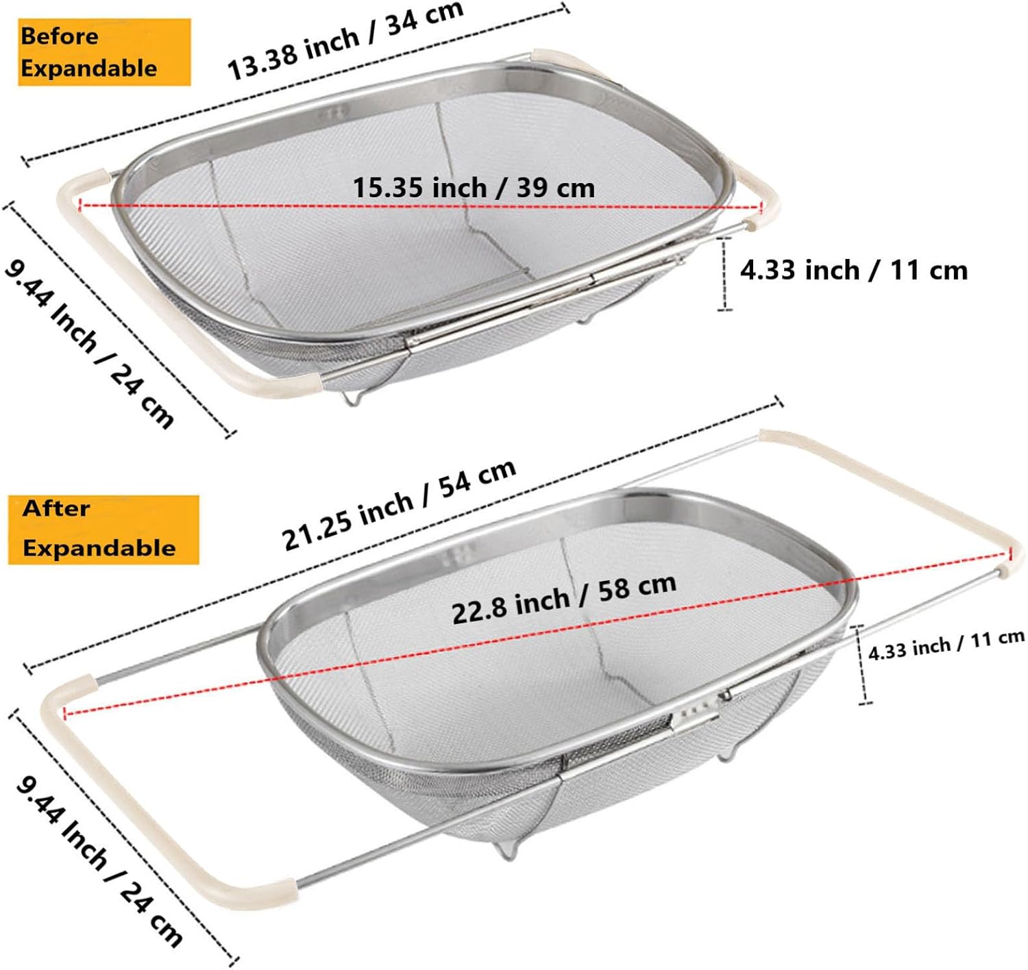 - Item Dimensions: 13.38 x 9.44 x 4.33 inches / 34 x 24 x 11 cm. With a fine mesh net strainer basket and expandable rubber grip handles. Heat resistant non-slip rubber handles expand from 14 inch out to 21.25 inch, It has a mirror finished wide rimmed frame with resting feet on the bottom.