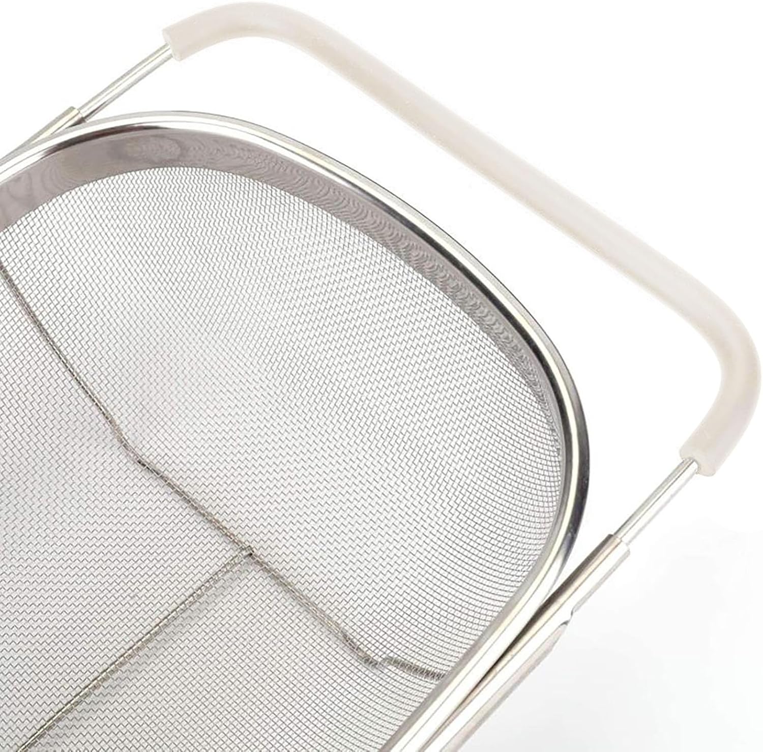 Over The Sink Colander, 6 Quarts Stainless Steel Oval Colander with Expandable Rubber Grip Handle, Fine Mesh Strainer Baskets Kitchen Colander for Strain, Drain, Rinse Vegetables, Fruits, Beige