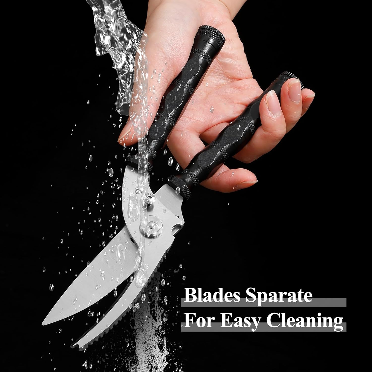 - 【Premium quality ultra-sharp Poultry shears】The high-quality kitchen poultry shears forged from premium stainless steel are sharper and thicker. Kitchen scissors are a professional heavy-duty kitchen scissors with a quick and easy detachable structure where one blade can be turned into a knife. The detachable blade also makes cleaning easier and does not leave a stain on the scissors.