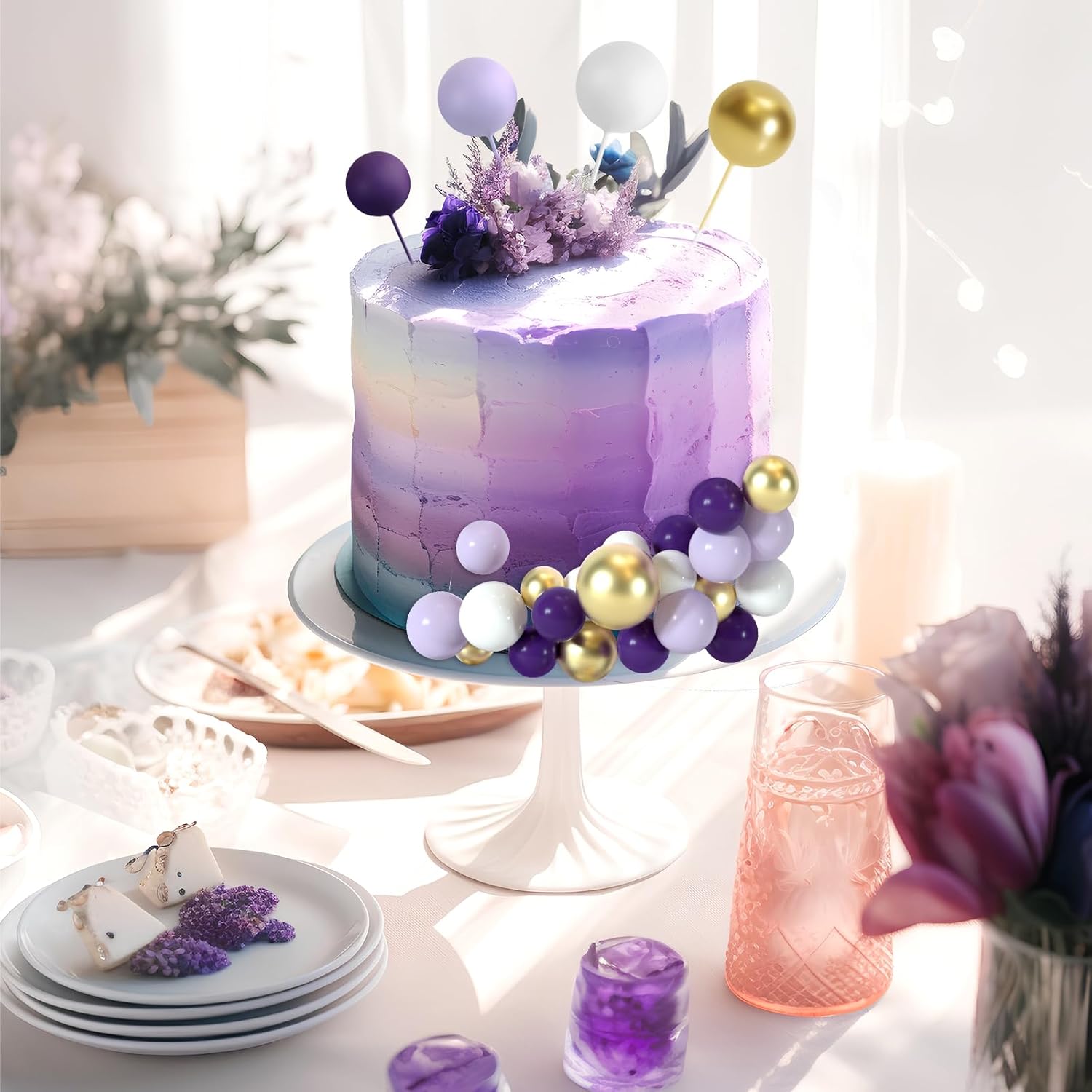 - Package Includes: You will get 48 pcs cake balls decorations in 4 colors and 10 butterflies cake decoration, including purple white gold and light purple. 12 pieces of each color. The quantity of each sizes and colors included in each set are as shown in the picture