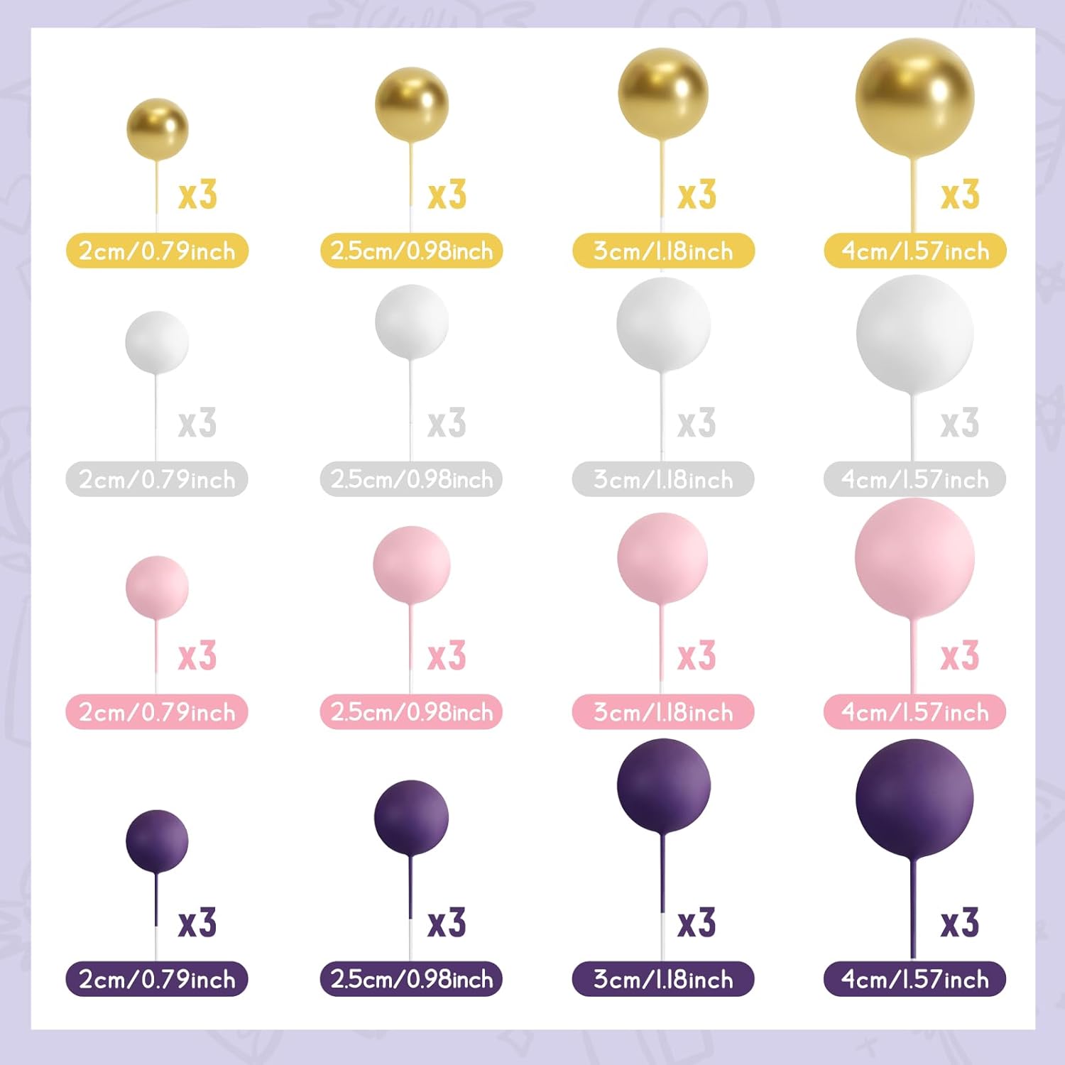 - Various Sizes: The diameter of these ball cake toppers are 0.79 inch/ 2 cm, 0.98 inch/ 2.5 cm, 1.18 inches/ 3 cm, 1.57 inches/ 4 cm, 12 pieces of each size. You can make a proper position arrangement based on the size and shape of your cake, sufficient quantity and various color of our ball shaped cake topper can meet your different needs