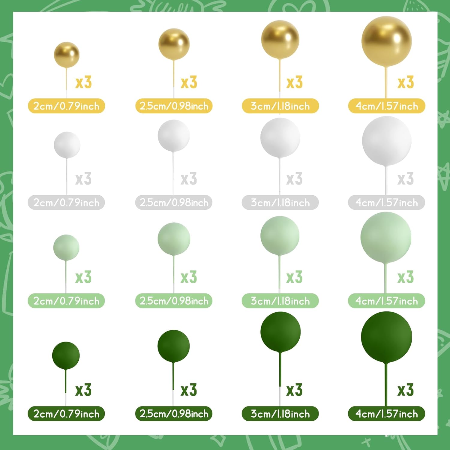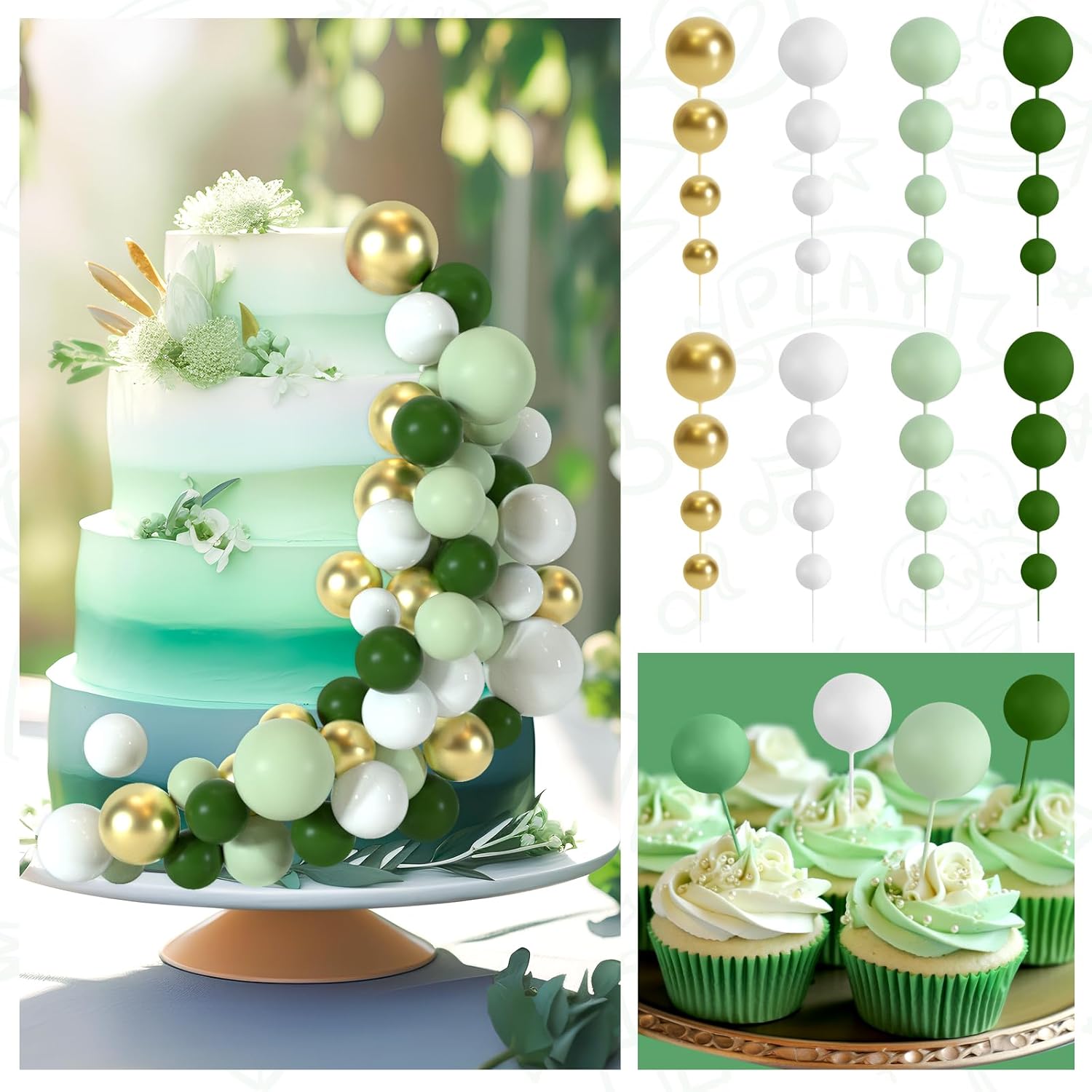 48 Pcs Cake Topper Decorations - Balloon Cupcake Toppers, Foam Balls for Birthday Party Wedding Cake Decorating (Green, Light Green, White, Gold)