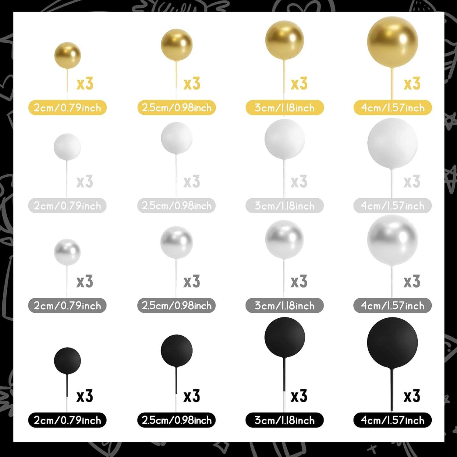 48 Pcs Balls Cake Topper Decorations Balloon Cupcake Toppers Foam Cake Topper Balls Cake Balls Decorations for Birthday Party Wedding Anniversary Cake Decorating (Black, Silver, White, Gold)