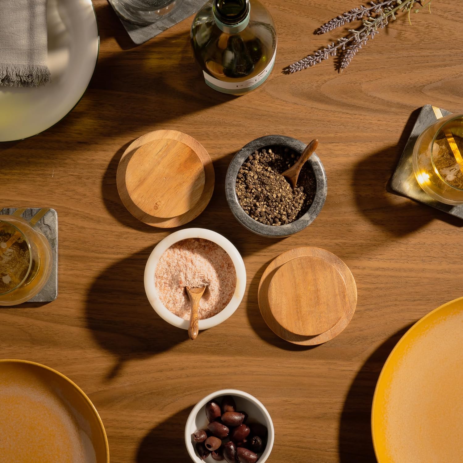 - Acacia Wood Lid and Spoon: Our salt cellar with lid and spoon features beautiful acacia wood. This salt keeper not only makes seasoning easy, it keeps your salt dry and protected.