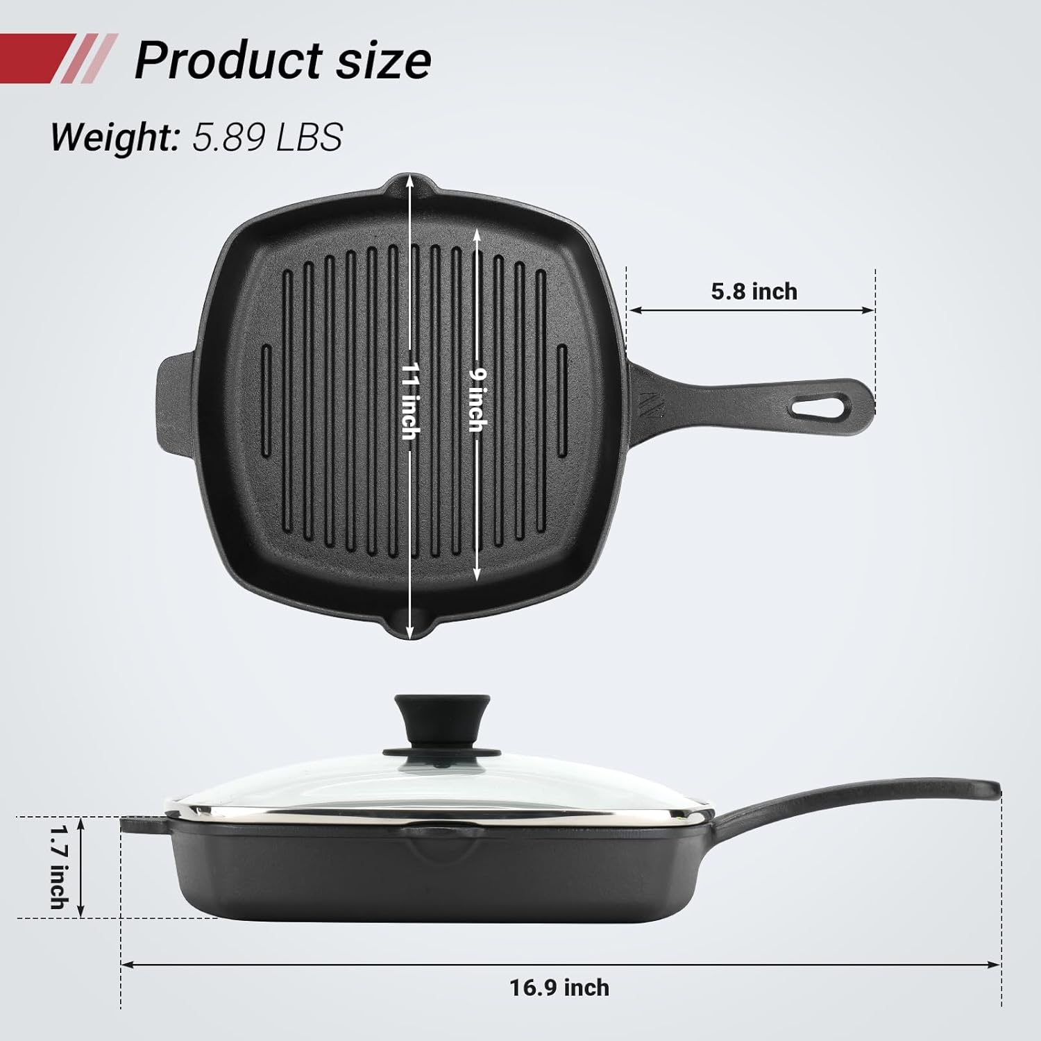 - 【SQUARE HEAVY GRILLING PAN】This cast iron griddle is 5.89lbs, will not slide on stovetop. Square pan is good for cooking in rows, like vegetables, chicken, sausage, fish, bacon, beef and hamburgers.