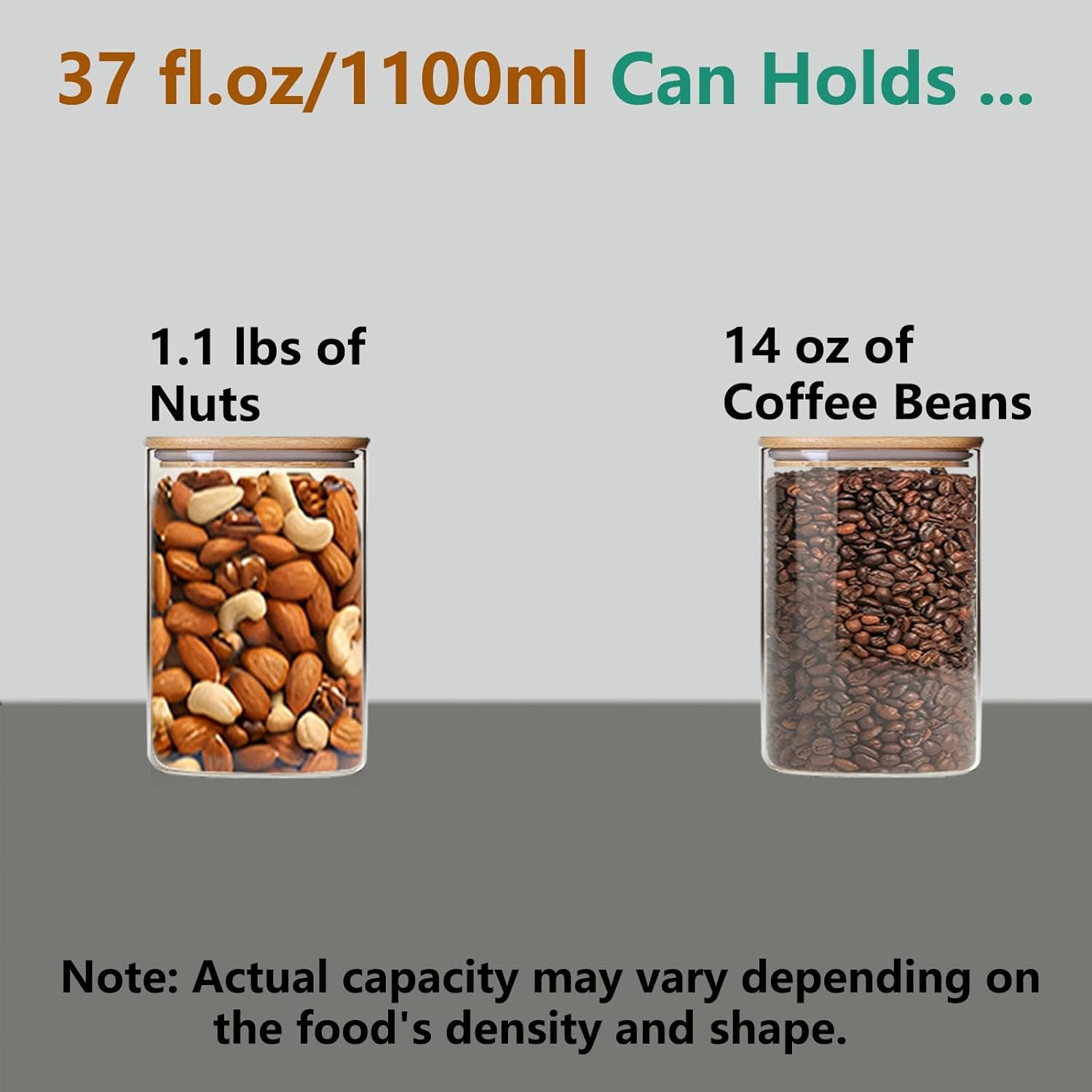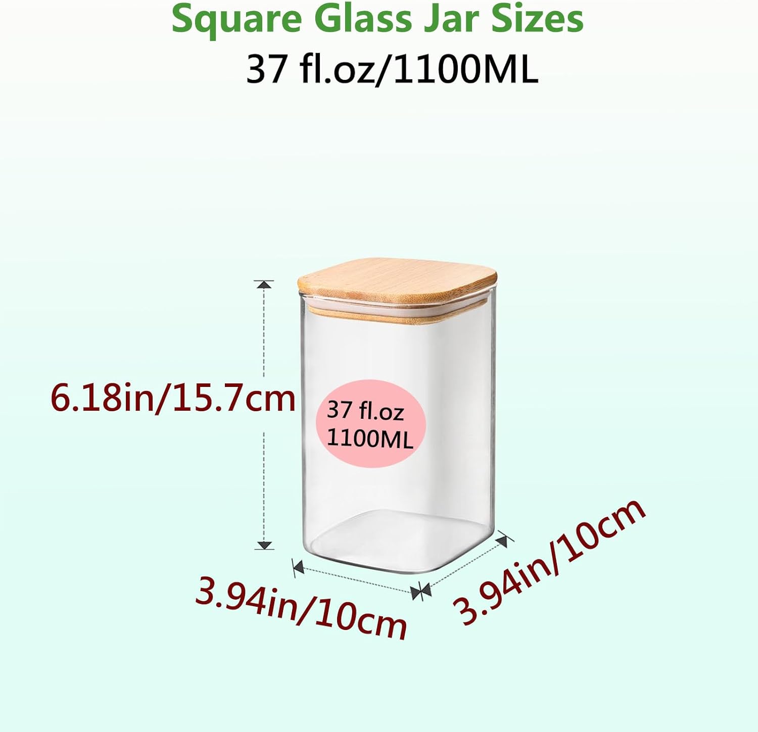 Square Glass Jars Canister with Wood Lid 37 FL OZ [Set of 4], Container Jar with Sealing, Lids for Oat Pasta Flour Cereal Rice Sugar Tea Coffee Beans, Best for Kitchen & Pantry