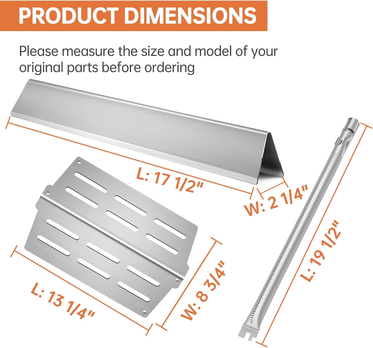 - 【Grill Replacement Parts Dimensions】5 Pack Grill Flavor bars: 117.5 X 2.25 X 2.375 inches, 2 Pack Heat Deflectors: 13 1/4” x 8 3/4” for each.3 Pack Grill Burner Tubes Pipe: 19 1/2" long each, Please double check the size of your original parts and compare with our grill replacement parts before ordering.