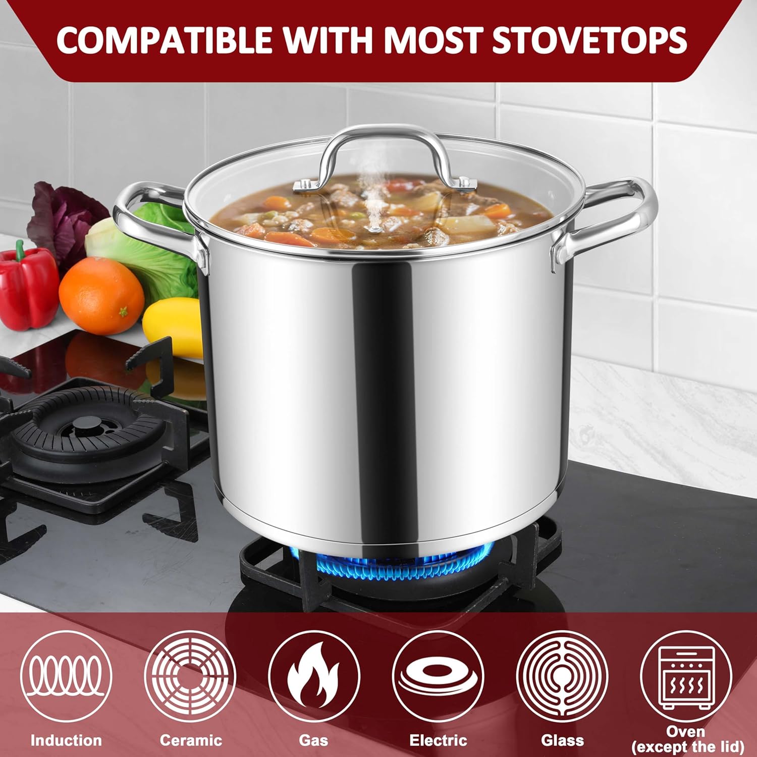 - Multipurpose, this stock pot is compatible with gas, electric, glass, ceramic, and induction, perfect for a variety of cooking methods, such as canning, jarring, and stewing, which is beginner-friendly and it can surely become one of your kitchen essentials