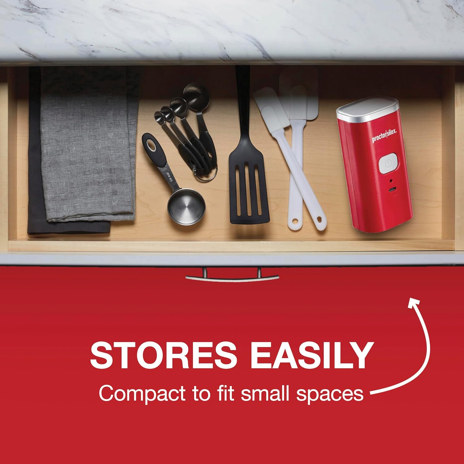 - SIMPLE TO STORE: This compact-sized electric can opener doesn't take up a lot of space. It easily fits in a kitchen drawer when it's not being used.