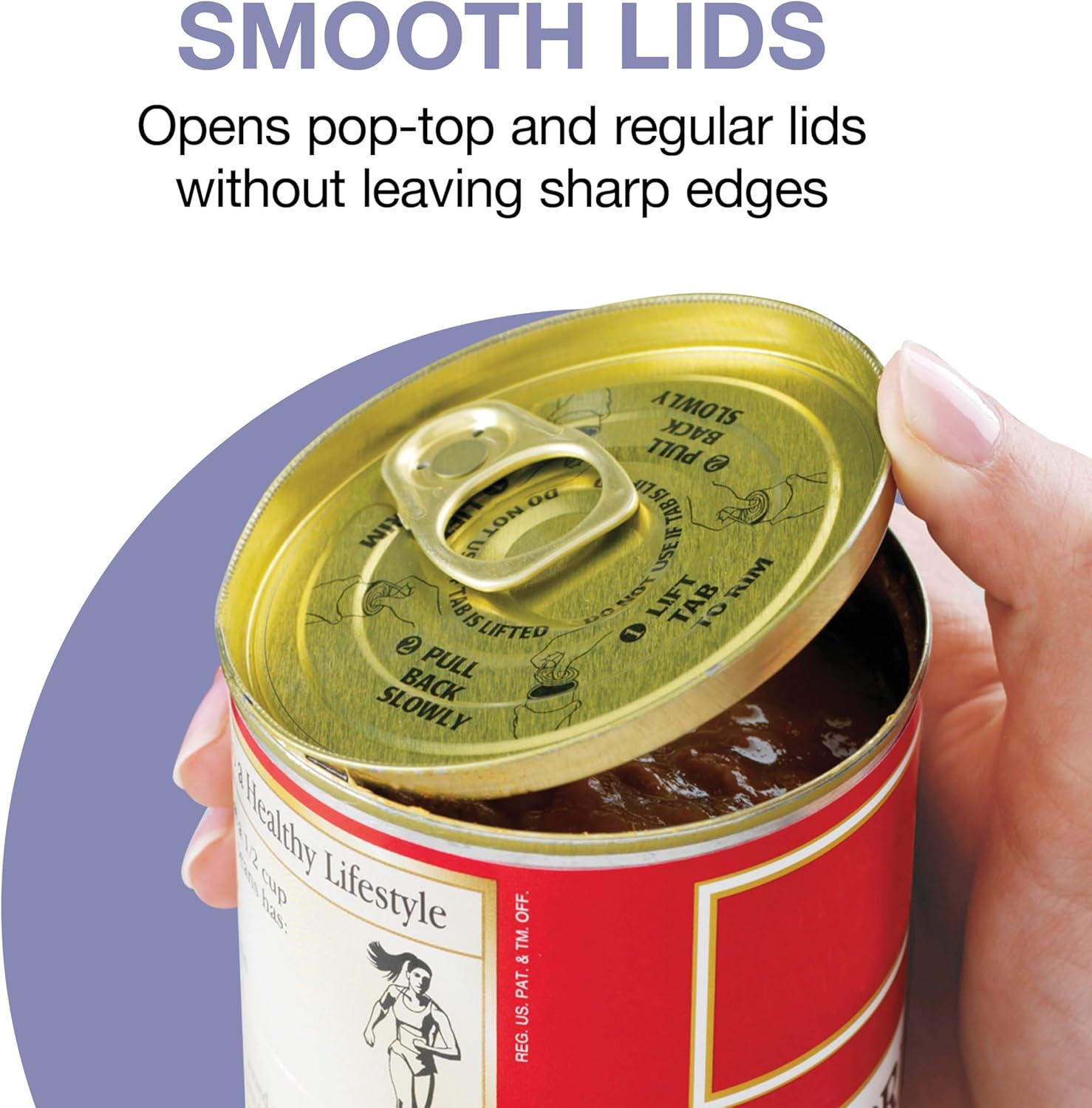 - SMOOTH, TOUCHABLE LID EDGES — This automatic can opener cuts cans along the side, eliminating sharp edges on both pop-top or regular cans. The blade stays clean because it doesn't touch food, and the lid can be reused to store leftover canned food in the fridge.