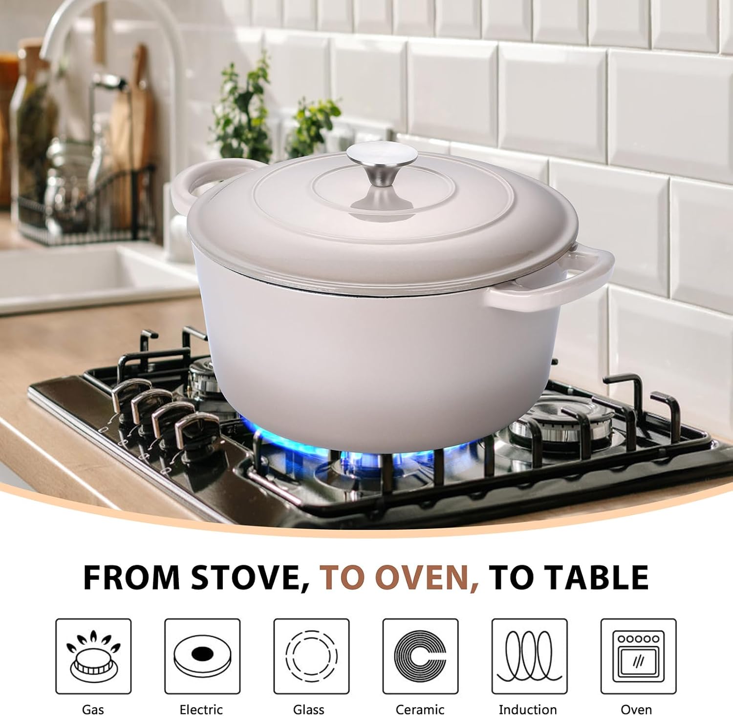 E-far 6 Quart Enameled Cast Iron Dutch Oven, Round Dutch Oven Pot with Lid, Nonstick Cookware for Braising/Stews/Roasting/Bread Baking/Cooking, Heavy Duty, Induction & Oven Safe - Khaki