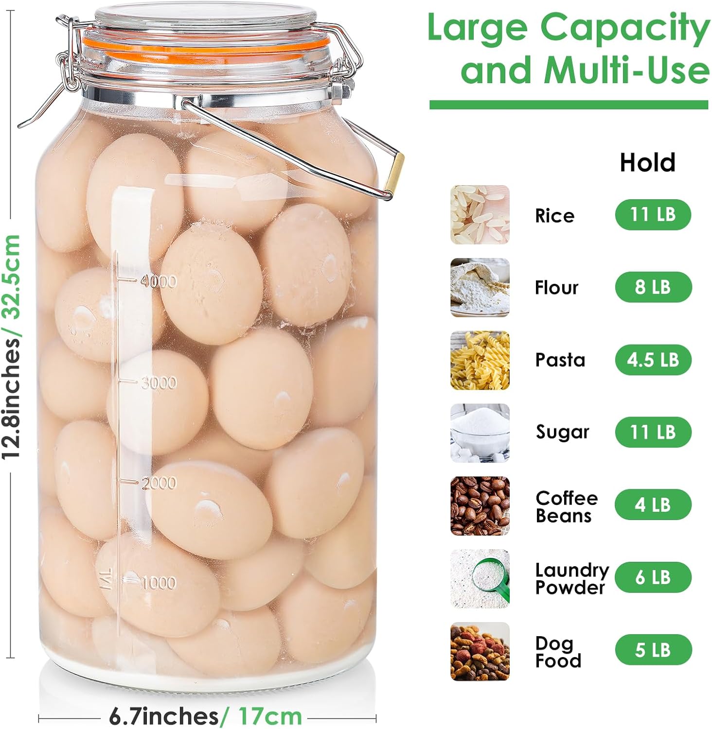 - Various Uses: -The large mason jar is useful for dry food storage, such as flour, sugar, oats, grains, rice, etc.. It can even be used for laundry rooms and bathrooms for laundry powder and bath ball, the perfect solution for all your kitchen and home organization needs.