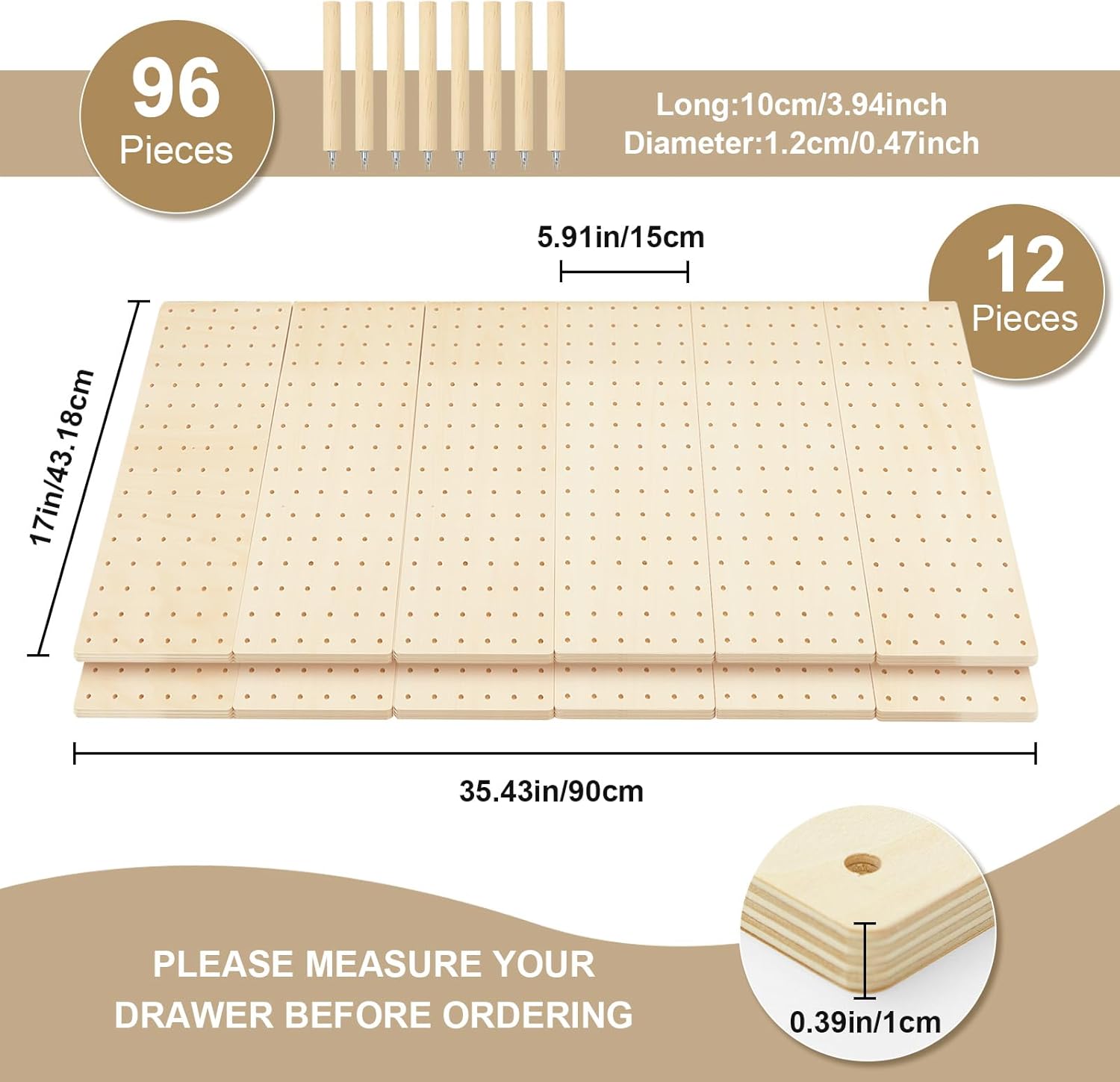 Kigley 12 Pcs Pegboard Drawer Organizer with 96 Drawer Peg Wood Peg Board Wooden Kitchen Plate Organizer for Dishes Food Containers Cookware Utensils(17 Inch,Wood Color)