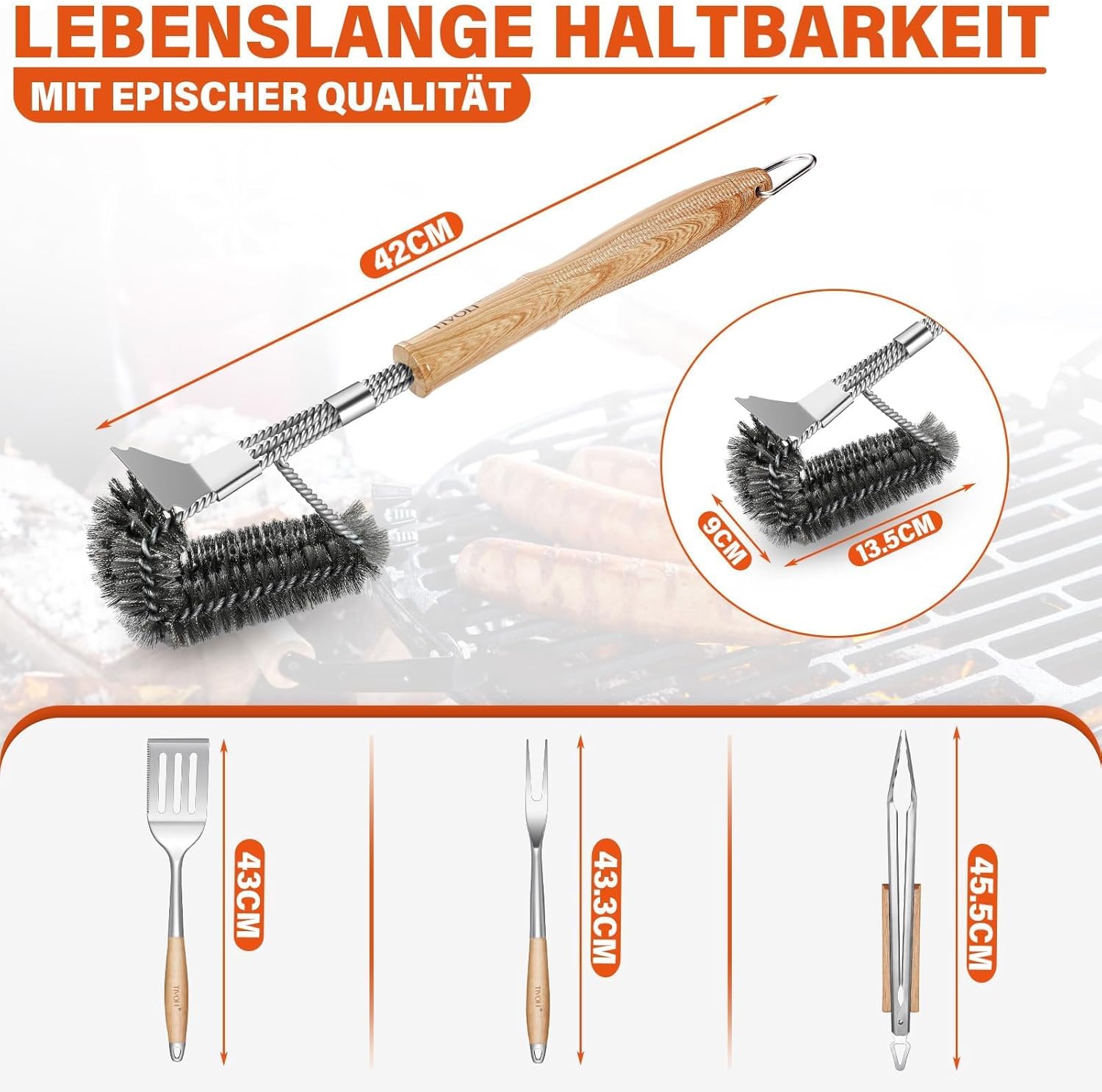 - ERGONOMIC DESIGN: Each tool in our grill set features an ergonomically oval-shaped handle that fits comfortably in your hand. The handles of each TIVOLI BBQ set are crafted from high-quality wood, providing a comfortable grip and distinctive look. Owning a TIVOLI BBQ set ensures you stand out in the crowd.