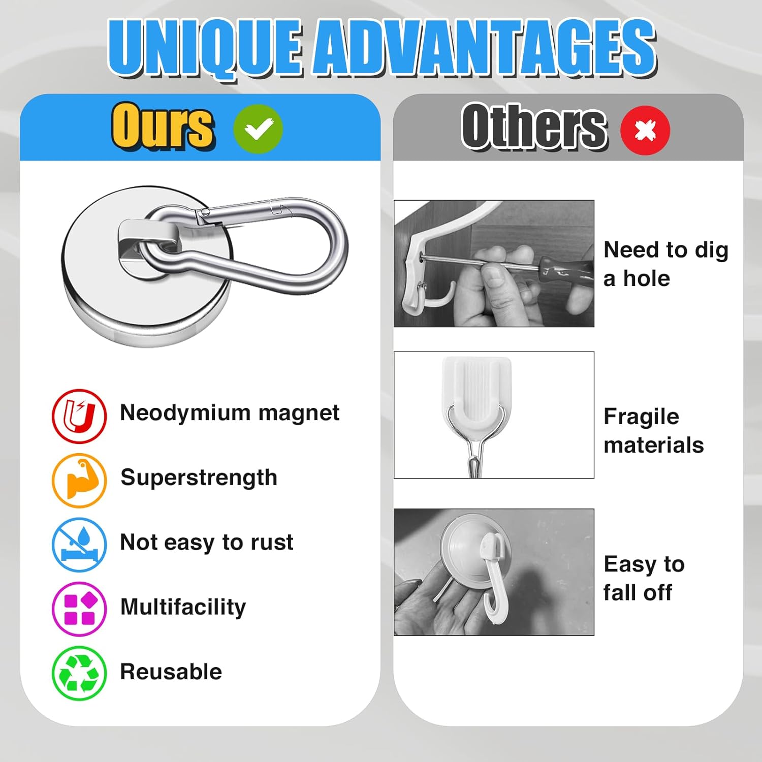 - 【Multi-Purpose Magnetic Hooks】-Our neodymium magnetic hooks offer a wide range of uses, securing various items in any place with iron or steel. Our super strong magnetic hooks are ideal for grills, pots, cups, cutlery, and ovens. In addition, you can also bring these heavy duty magnetic hanging hooks to the cruise ship to decorate the metal walls or doors of the Carnival cruise ship cabin.