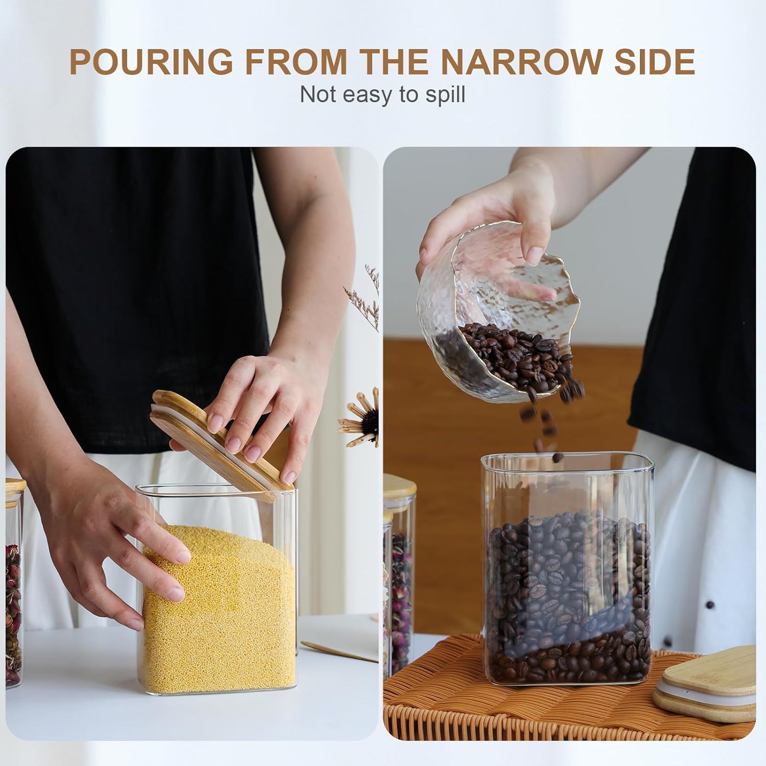 - Elegant and Practical Design: Elevate your kitchen organization with the sleek, square design of our Glass Food Storage Jars. These jars aren't just functional – they're also a stylish addition to your countertop or pantry. The clear glass allows you to easily identify the contents, making meal prep and cooking a breeze.