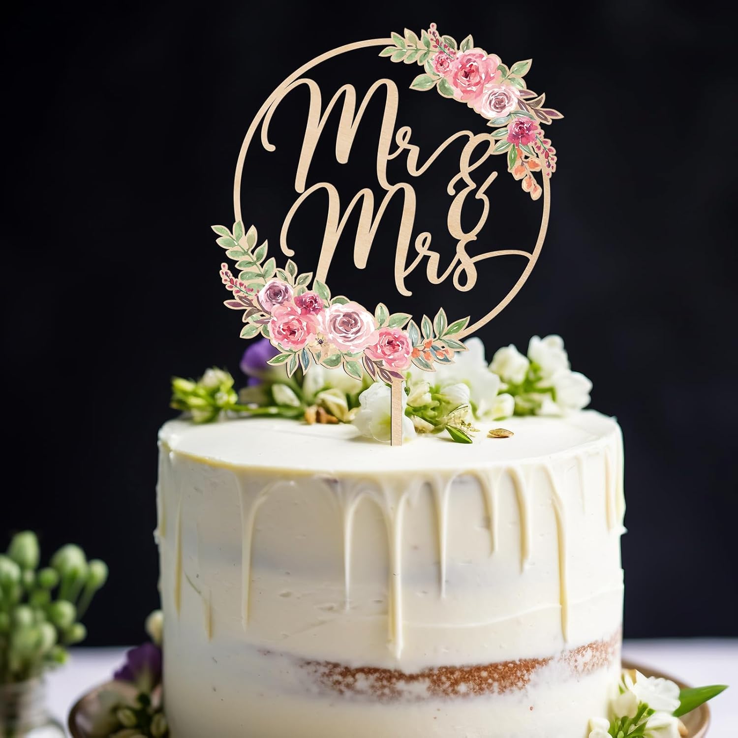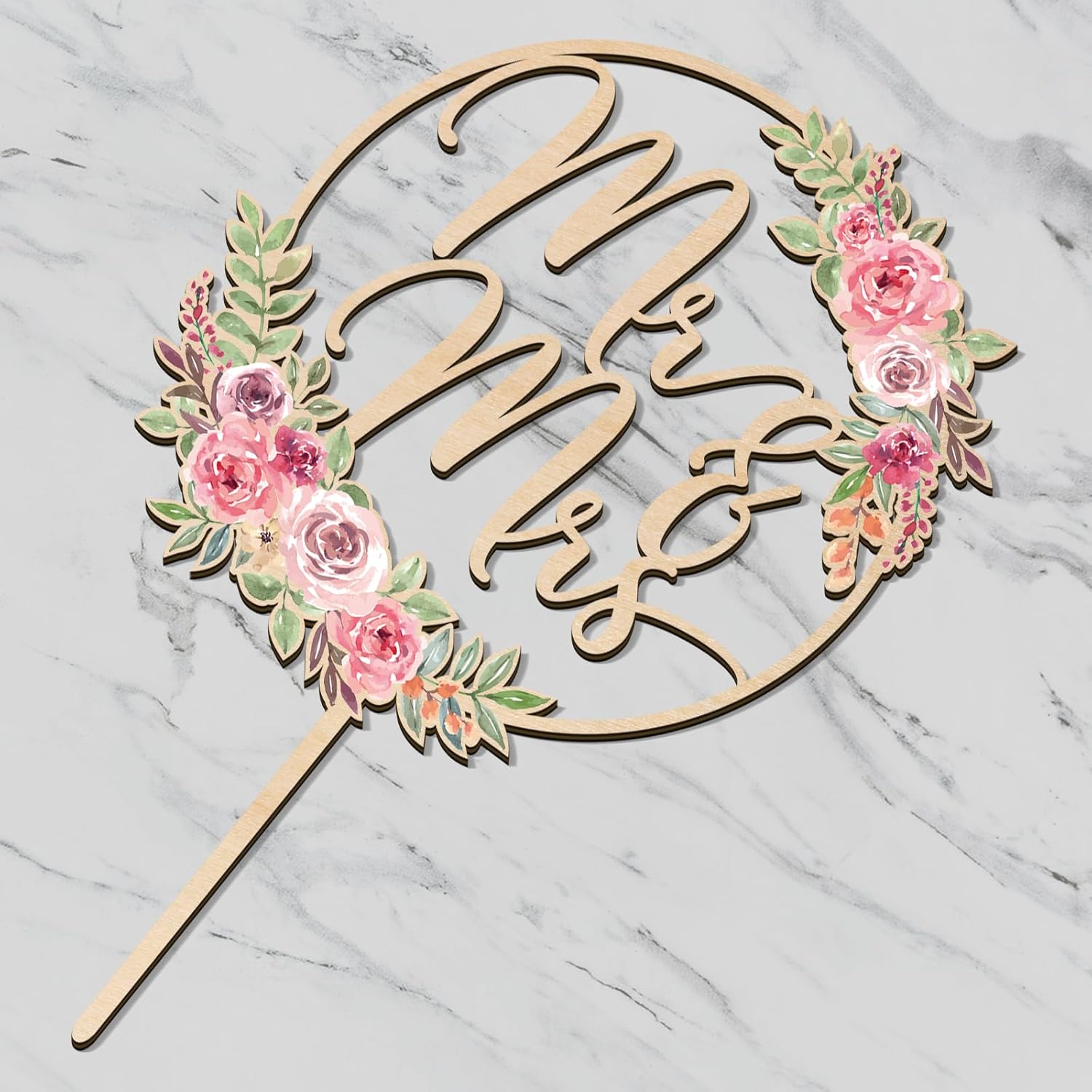Mr & Mrs Cake Topper Floral Wedding Cake Topper in Wood (Design 01)