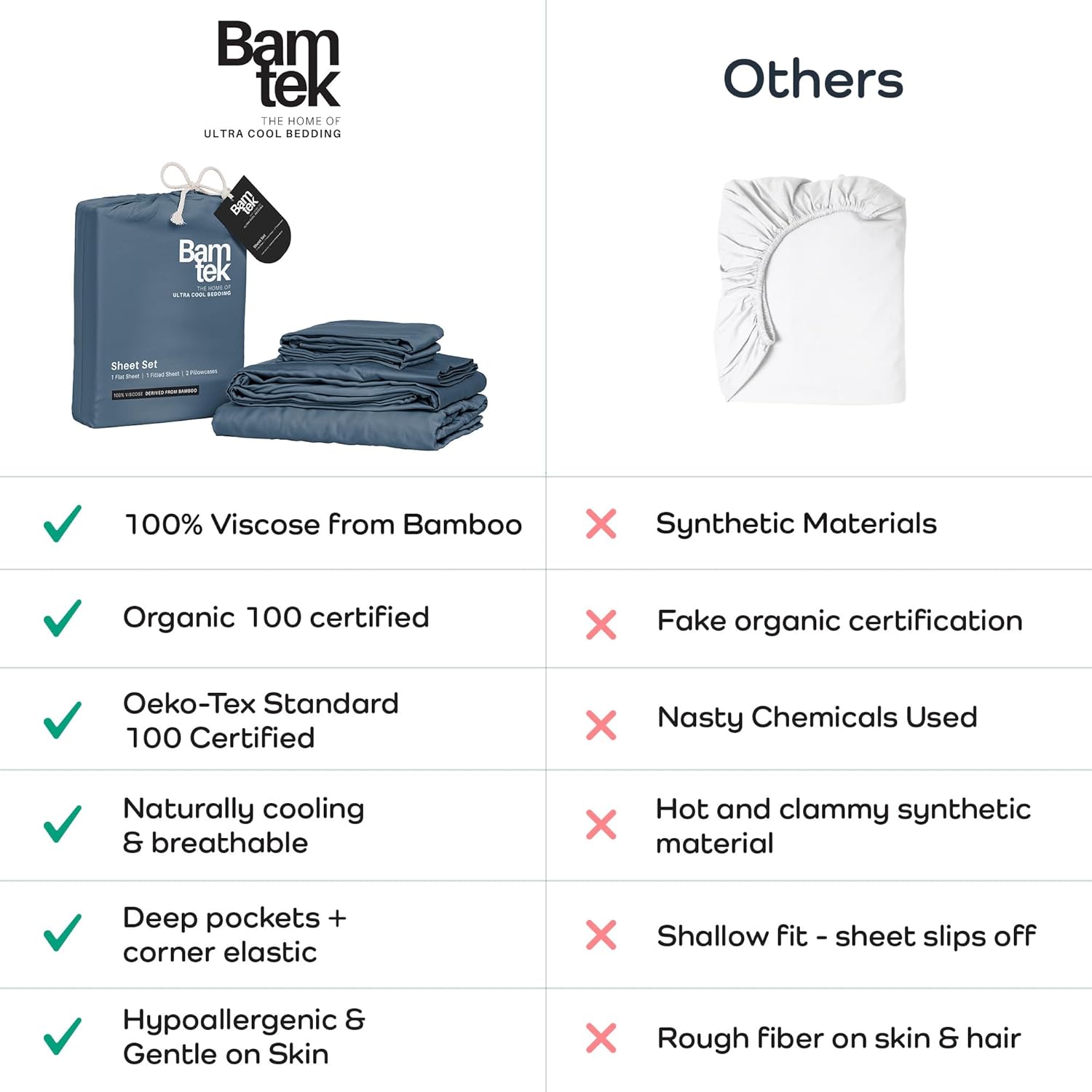 - Because You Deserve Better: Say goodbye to harsh chemicals, Bamtek 100% Viscose Bamboo Sheets are organically certified & Oeko Tex standard 100 certified - skin friendly, a hypoallergenic bedding and those who value pure natural comfort.