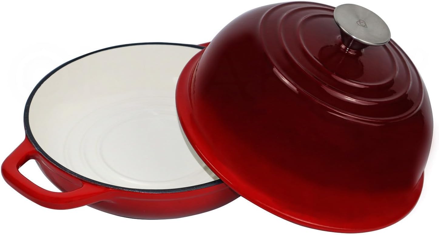 - Material features: Made of cast iron, glossy enamel exterior and white enamel interior, stable performance, oven safe up to 500℉. Compatible with various heat sources: gas, induction, ceramic, electric, oven, etc