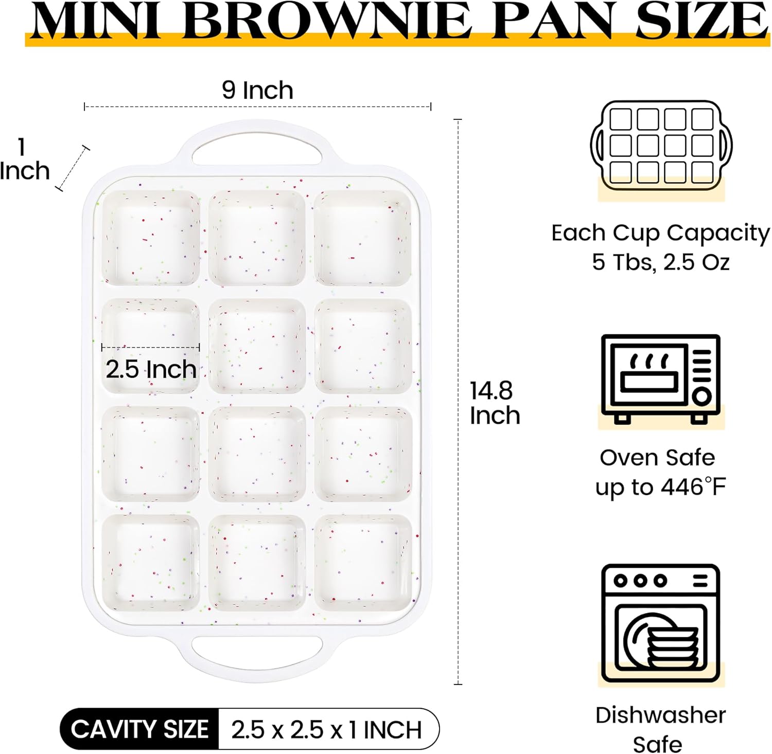 - Durable & Long Lasting:The stainless steel reinforced frame provides exceptional durability and stability to the silicone brownie pan. You can confidently fill enery individual cavity with batter without worrying about the brownie baking pan bending or warping. Each nonstick brownie pan is 14.8 x 9 x 1 inch, cavity size is 2.5 x 2.5 x1 inch