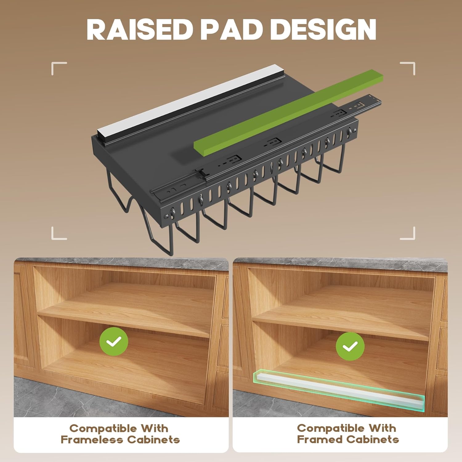 - 【Slide Pull Out Design】: The pot and pan lid rack is designed with sliding rails and a built-in pulley ball, which makes it easy to organize and store your cookware with just one pull. The pan lid organizers comes with 2 strips of tape to secure the slides inside the cabinet, which protects the cabinet from drilling and damage, uick setup with no tools needed. Slide out pots and pans organizers make the most of your kitchen space, providing you with a more efficient and hassle-free experience.