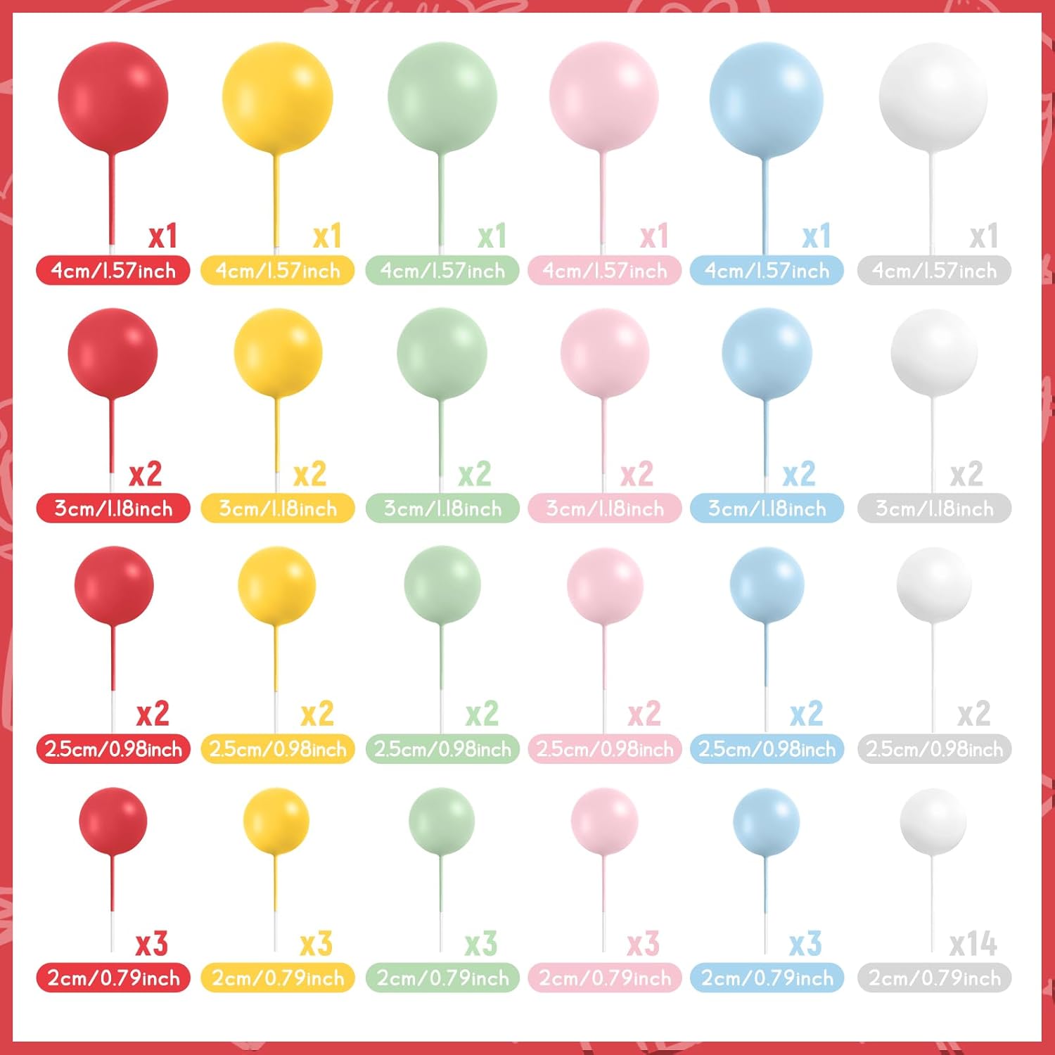 - Various Sizes: The diameter of these ball cake toppers are 0.79 inch/ 2 cm, 0.98 inch/ 2.5 cm, 1.18 inches/ 3 cm, 1.57 inches/ 4 cm, 12 pieces of each size. You can make a proper position arrangement based on the size and shape of your cake, sufficient quantity and various color of our ball shaped cake topper can meet your different needs
