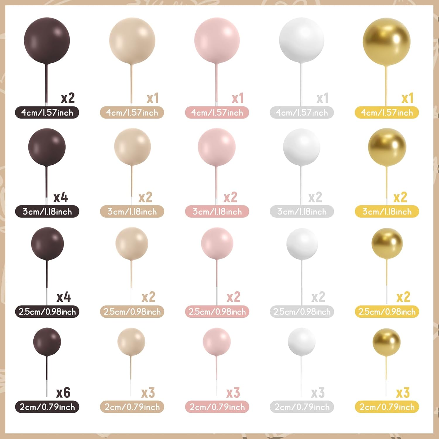 - Various Sizes: The diameter of these ball cake toppers are 0.79 inch/ 2 cm, 0.98 inch/ 2.5 cm, 1.18 inches/ 3 cm, 1.57 inches/ 4 cm, 12 pieces of each size. You can make a proper position arrangement based on the size and shape of your cake, sufficient quantity and various color of our ball shaped cake topper can meet your different needs
