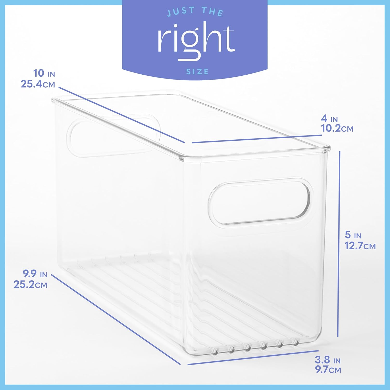 6 pack Clear Plastic Storage Container Bin with Integrated Easy Grip Handles. For Kitchen, Fridge, Freezer, Cabinet, Pantry, Bathroom Organization. 10"x4"x5"