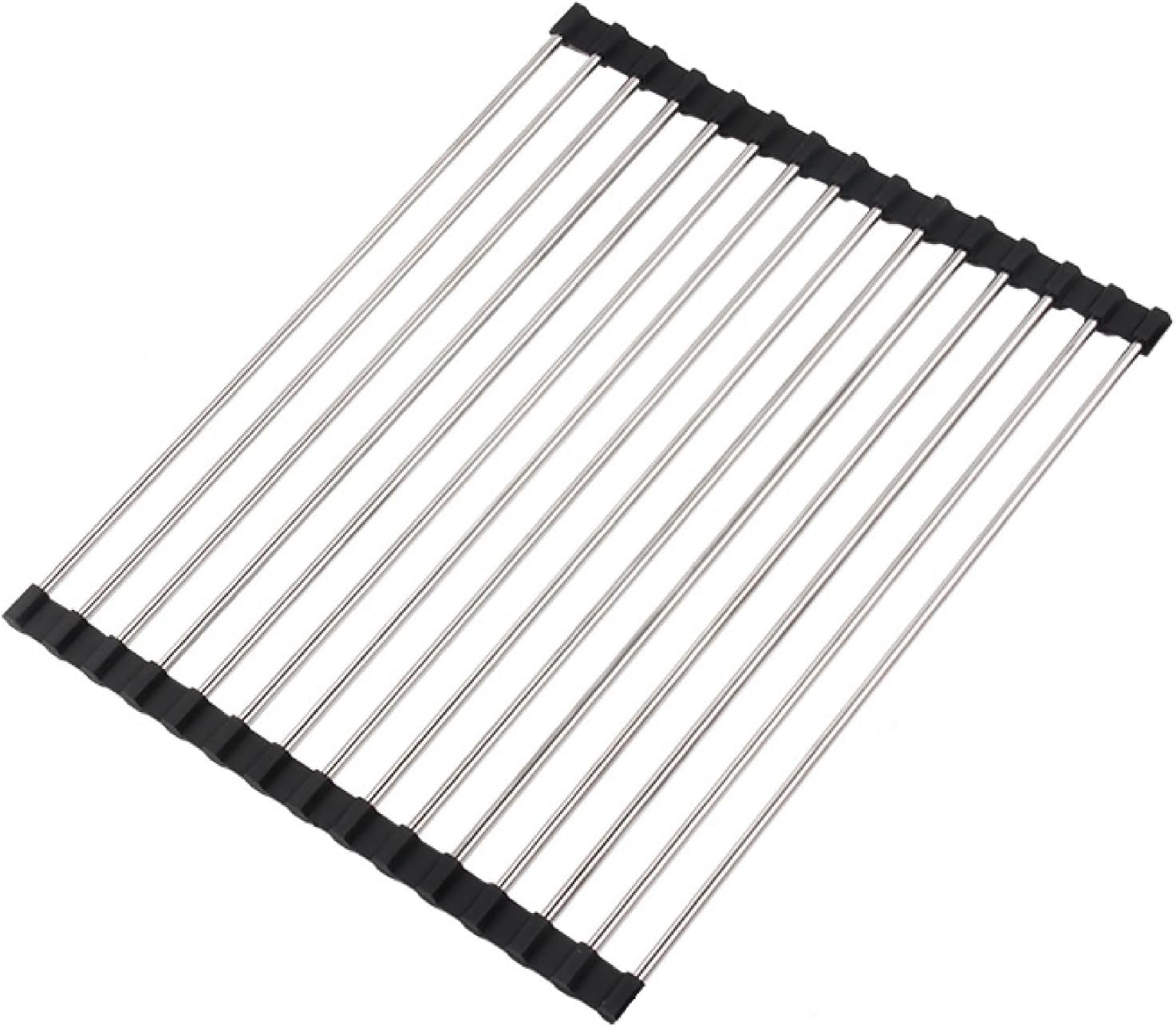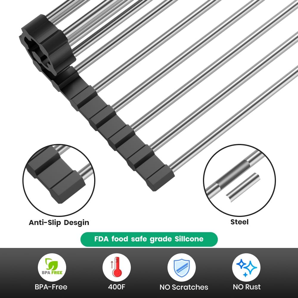 Roll Up Dish Drying Rack, Stainless Kitchen Accessories, Foldable Dish Rack, Anti-Slip Design Sink Counter Storage, Over The Sink Dish Rack, Stainless Steel, ((17.5" x 12") Black)