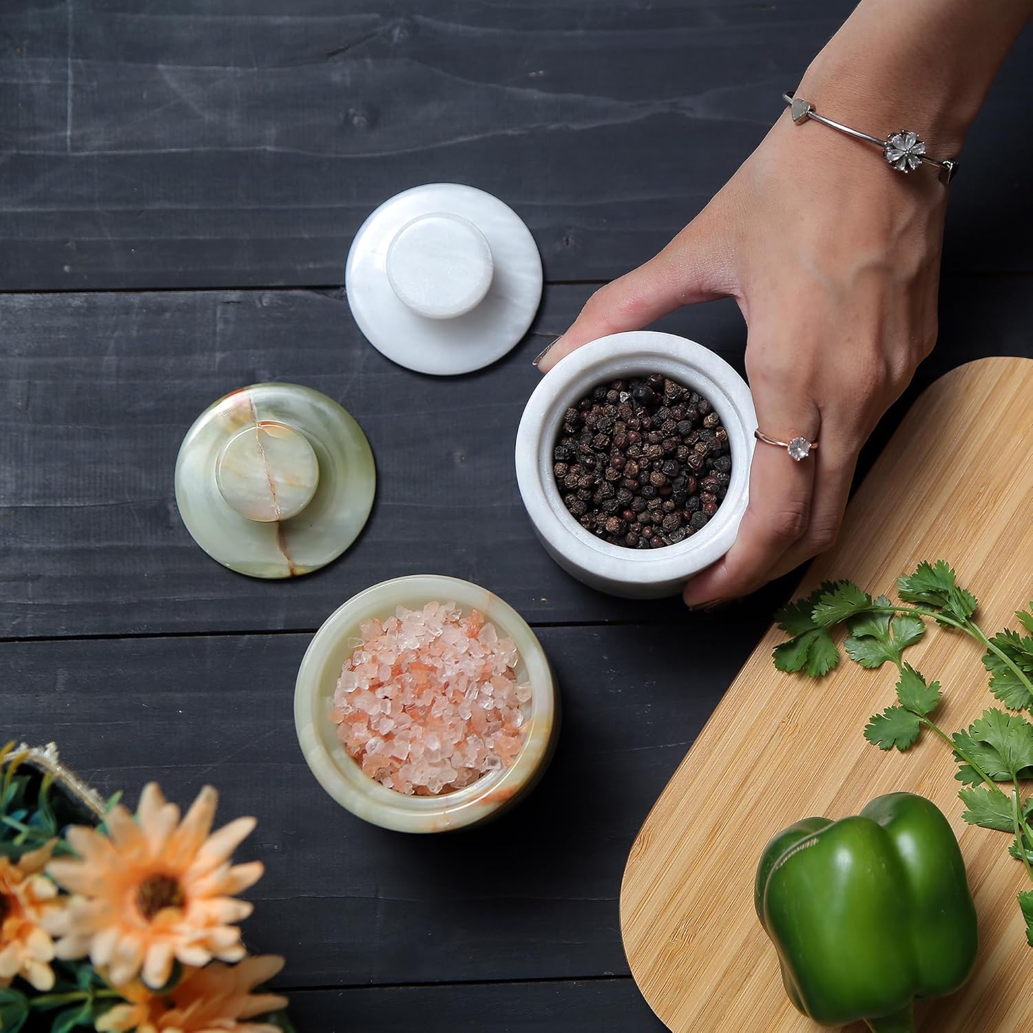 Marble Salt Cellar With Lid- Pack Of 2 Marble Salt And Pepper Bowls- Salt Holder With Lid To Put Salt, Paprika, Pepper, And Spice (Onyx Green & White, Style 01)
