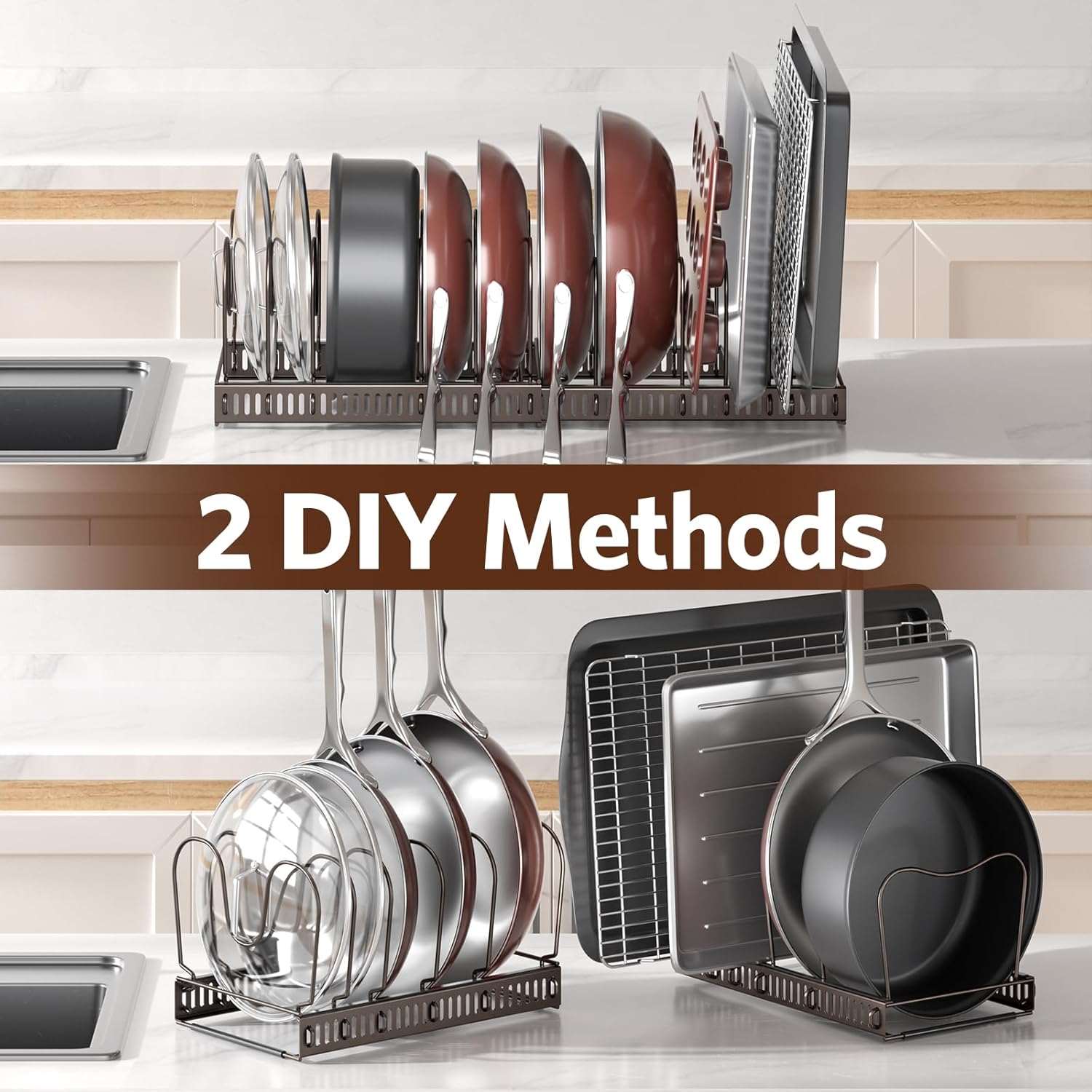 - 2-in-1 Pan Rack - ORDORA There are two ways to maximize space with pot organizer rack for under cabinet. Use it as a cookie sheet pan organizer for cabinet or split it into 2 sections for pots and lids. Compact enough for countertops or shelves, it’s a flexible cabinet organizer for pots and pans for any spaces