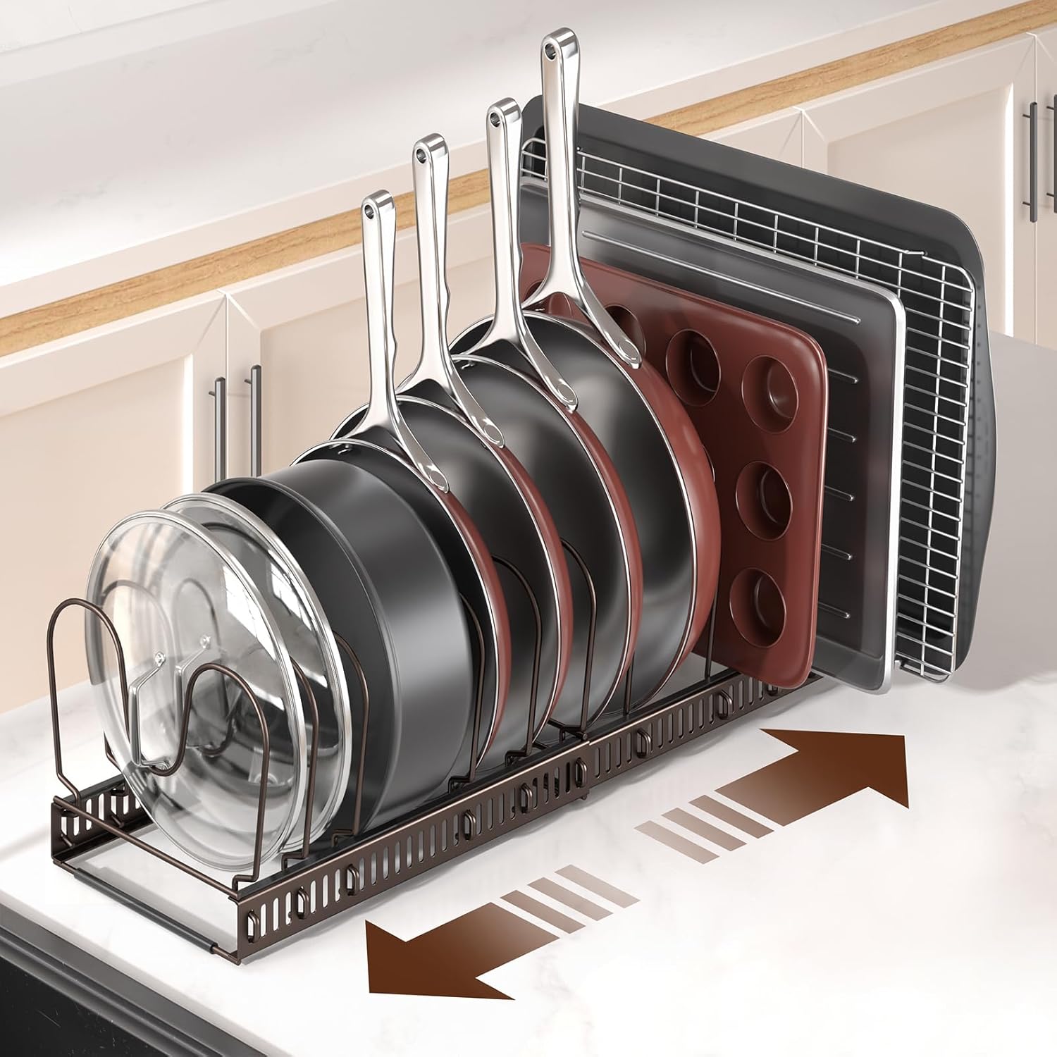 - Extendable Pan Holder & Space Saver - ORDORA pots and pans organizer under cabinet serves as a versatile cutting board rack storage for kitchen, with 12 adjustable dividers and an 11.8"-22.8" expandable frame. Designed for cabinets or countertops, this pan rack organizer efficiently stores pots, pans, and lids of all sizes—ideal for kitchens needing pan organizers and storage without clutter