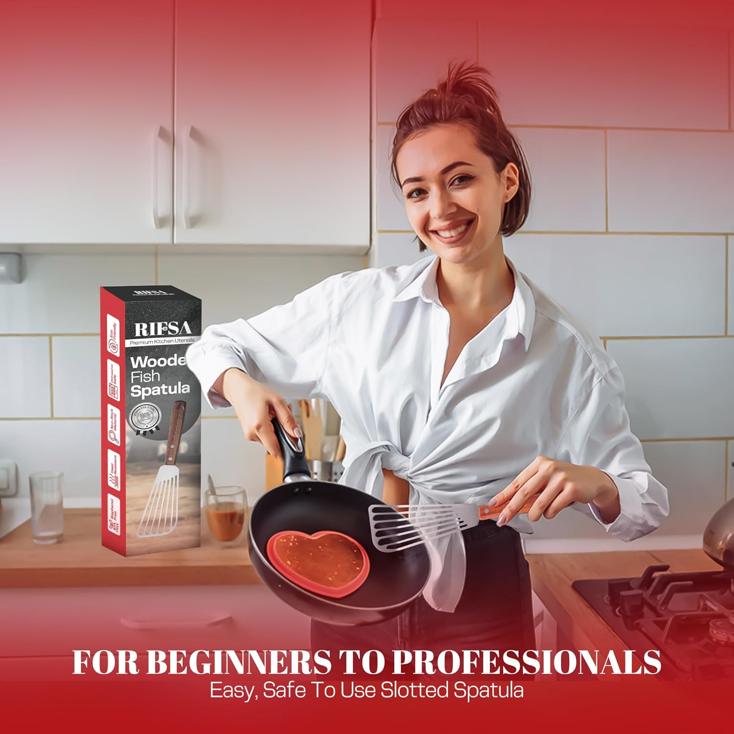 - ♦️[Ergonomic Wooden Handle] ➤ The spatula’s wooden handle offers a secure, comfortable grip, allowing you to lift and flip foods with ease. Its ergonomic design ensures balance and comfort during long cooking sessions.