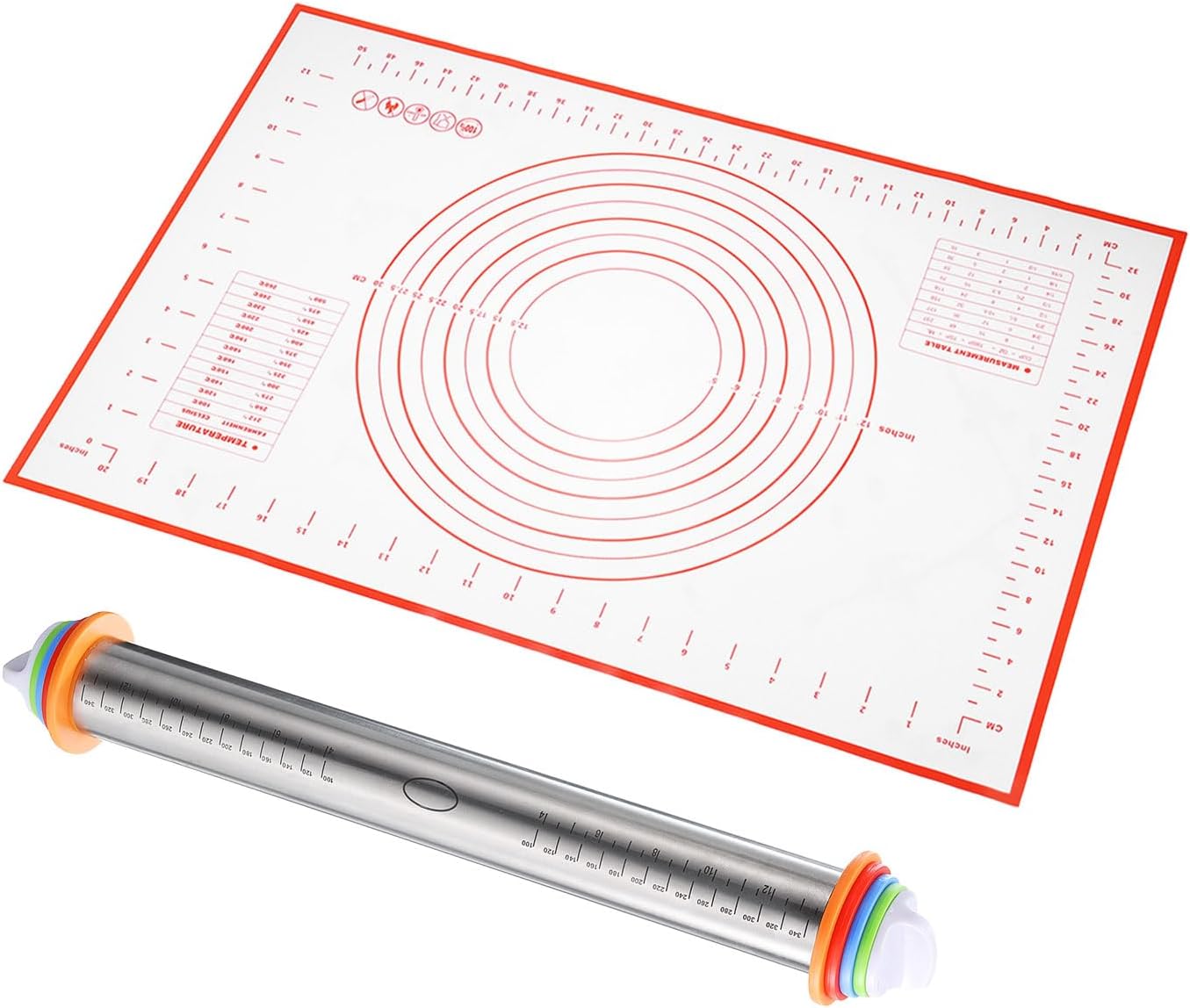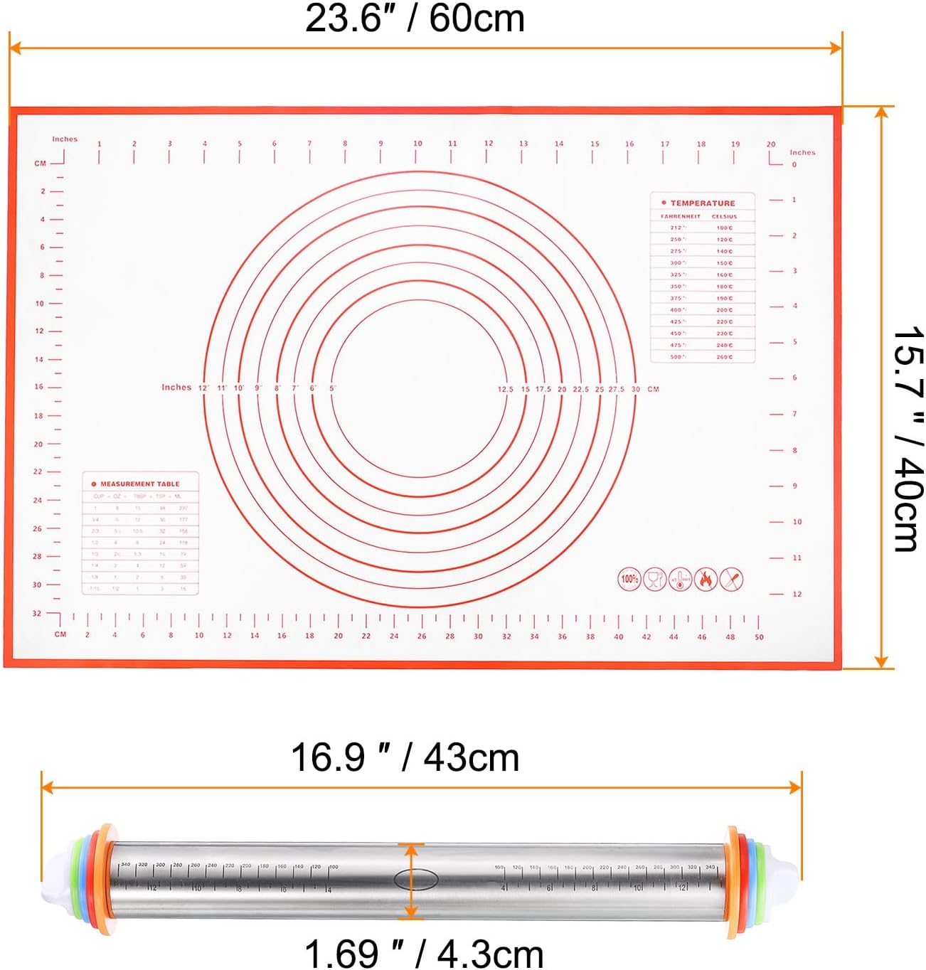 - Size - The plastic rolling pin measures 16.9 Inch x 1.69 Inch /43cm x 4.3cm (L*D), and is very light for long-time use without tired hands, and the size of the baking mat is about 23.6 inches ×15.7 inches(60cm*40cm )