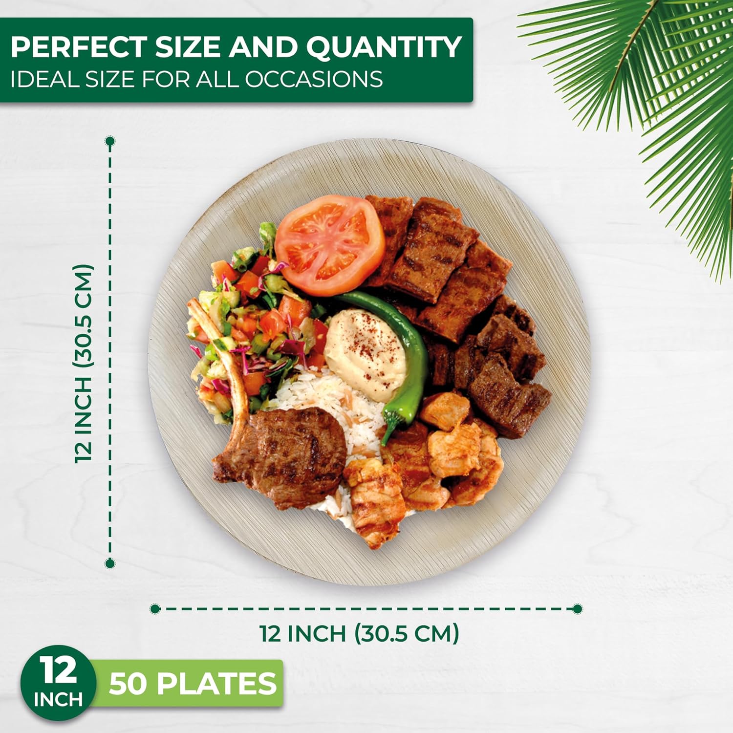 Palm Leaf Disposable Plates - Bamboo Plates Disposable 12 Inch Round (50pc) - 100% Compostable & Biodegradable Plastic-Free Plates - Heavy-Duty, Party Dinnerware Set - Microwave & Oven Safe