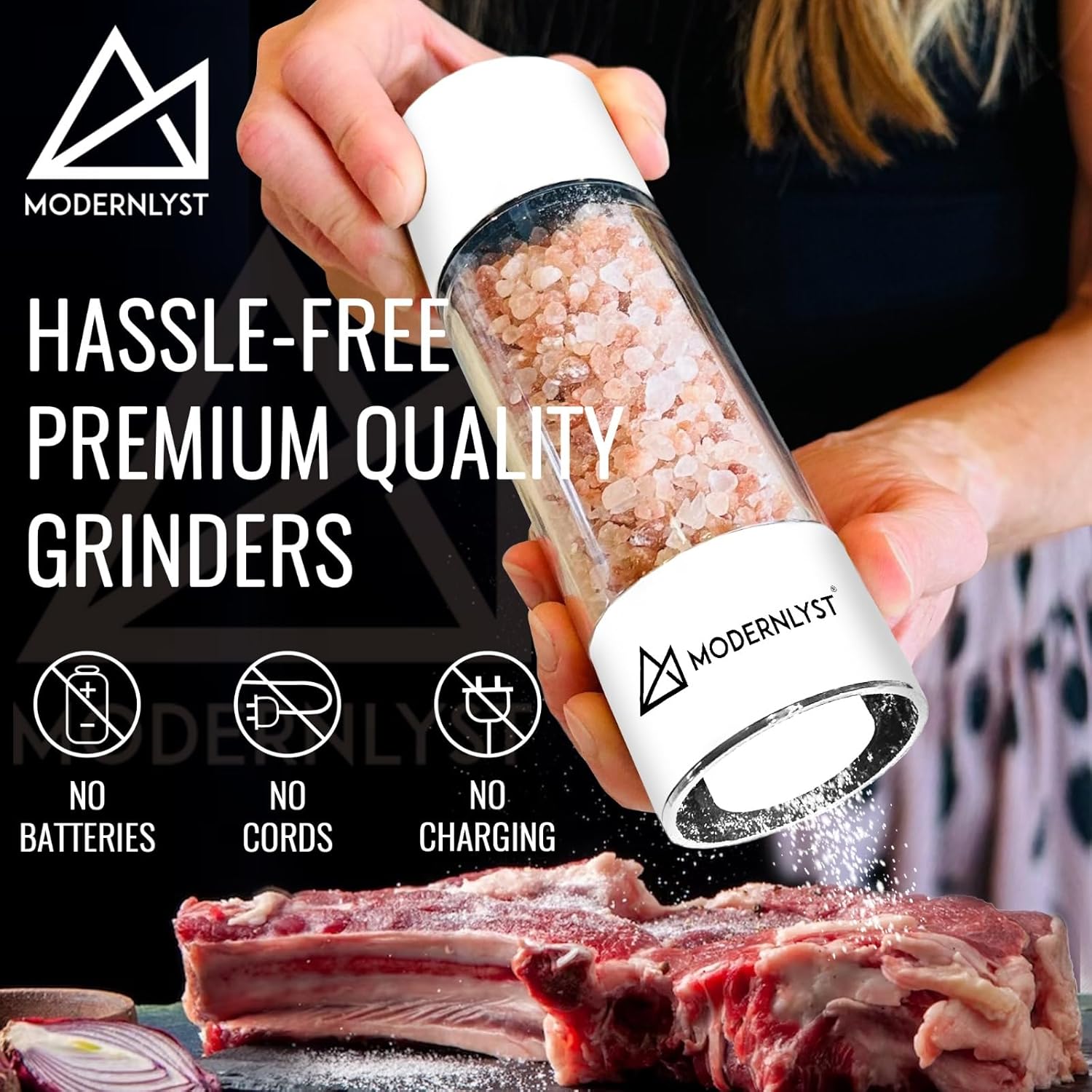 - STYLE & DESIGN - Because of its unique round design, our salt and pepper grinder set manual stands out as a modern addition to any kitchen while also complementing its surroundings. Beautiful on kitchen countertop or dining table.