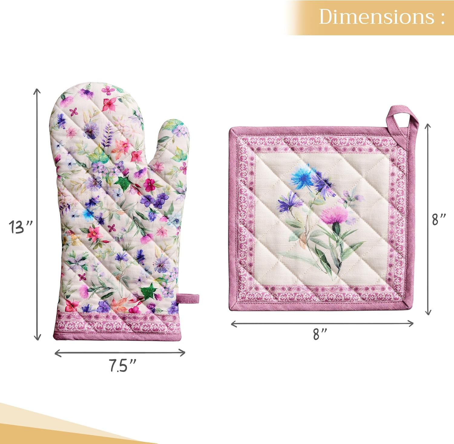 Maison d' Hermine 100% Cotton Oven Mitt & Pot Holder Set (7.5"x13" & 8"x8") Heat Resistant BBQ Cooking Gloves with Loop, Baking, Grilling, Kitchen, Handling Hot Pans Spring/Summer (Chardon)