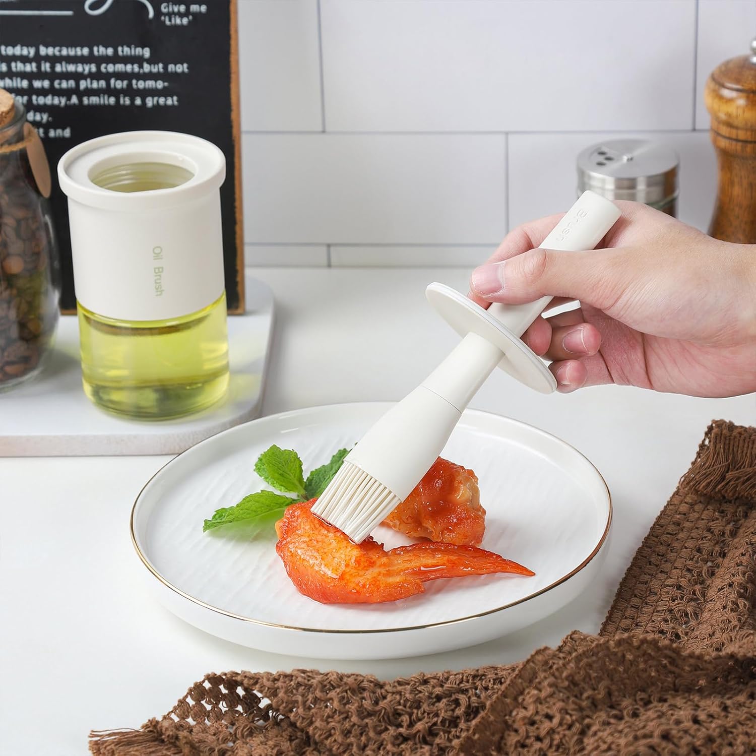 - Oil bottle with silicone brush - This oil bottle with brush is equipped with a silicone brush, which is soft and flexible, very convenient to optimize the amount of oil on the dishes and distribute sauces evenly without wasting. And the silicone brush is very practical to control the portion of oil while your are cooking, especially when you are on a diet.