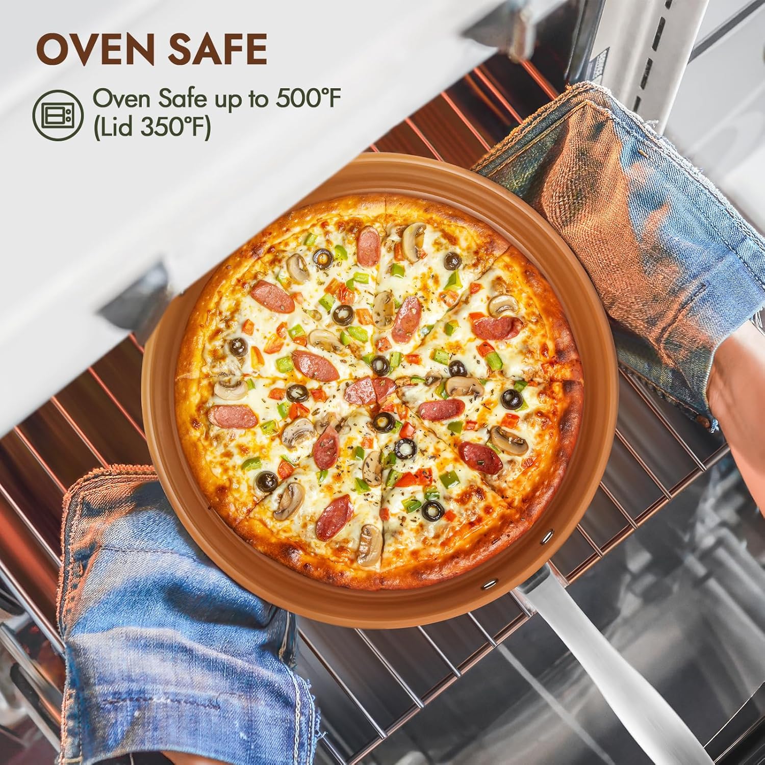 - FROM STOVETOP TO OVEN: Oven safe up to 500°F (pan) and 350°F (tempered glass lid), deep frying pan transitions seamlessly from searing on the stove to finishing in the oven