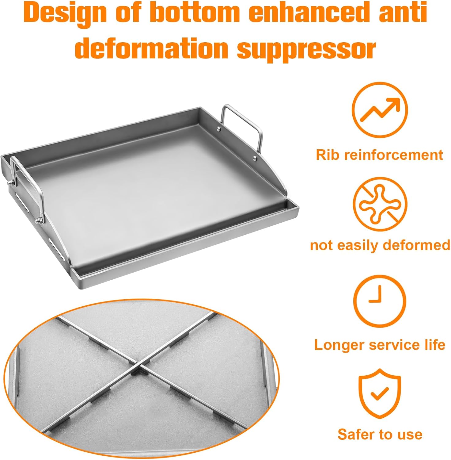 - 【Design Features】 Equipped with a heat distortion inhibitor, this grill Griddle prevents heat distortion and maintains its stability. The polished edges prevent scratches, and the high sidewalls prevent grease and food splatters, ensuring your food stays on the grill plate