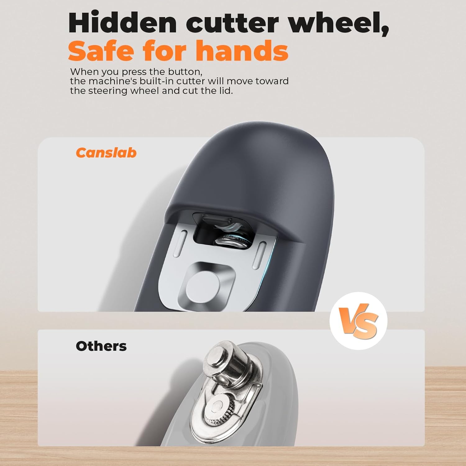 - 【USB Rechargeable】- Canslab USB rechargeable can opener has a built-in 2000mAh rechargeable battery that opens approximately 100 cans*, which is 4 times the quantity cut by the aa batteries type until the batteries are drained. It is a cost-effective choice. Best for home kitchen and outdoor camping. *Data from Canslab lab, can sized 10.75oz. The number of cans opened may vary depending on the size of the can.