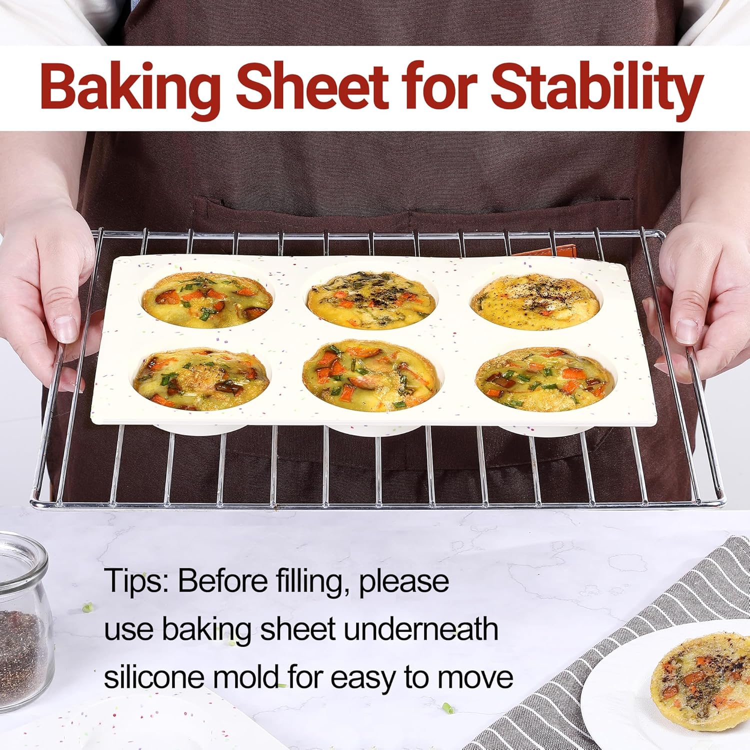 - Tips: Due to made out of silicone, it's flexible, please make sure to put silicone baking pan on a cookie sheet for support before filling in