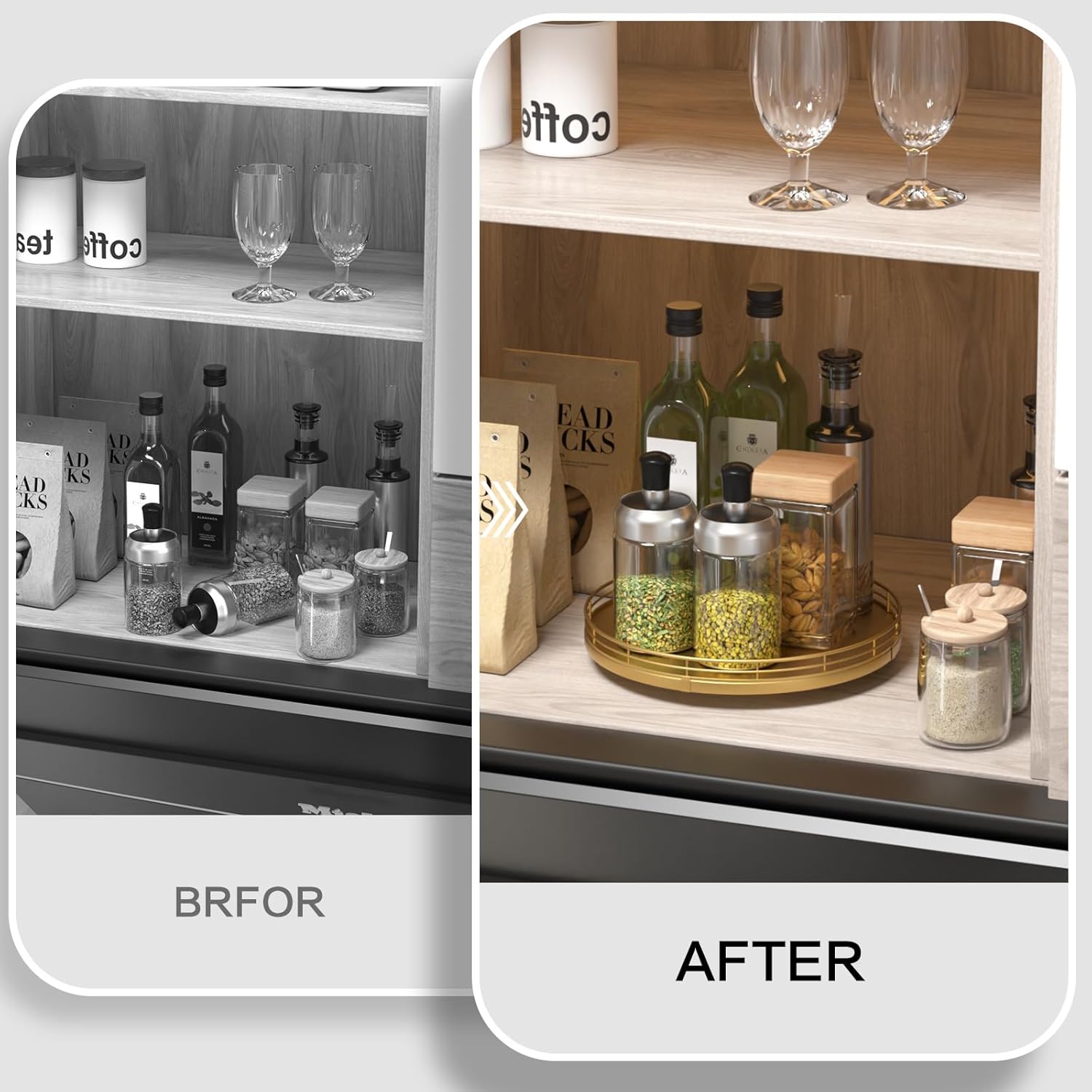 - ๐ง๐ต๐ผ๐๐ด๐ต๐๐ณ๐๐น ๐๐ฒ๐๐ถ๐ด๐ป: The turntable gold tray features a smooth and silent 360ยฐrotation; Bottom slip-resistant pads for stability and protect your countertop from scratches; Raised edges on each organizer tray to keep items from falling out; Easy to use, no installation required