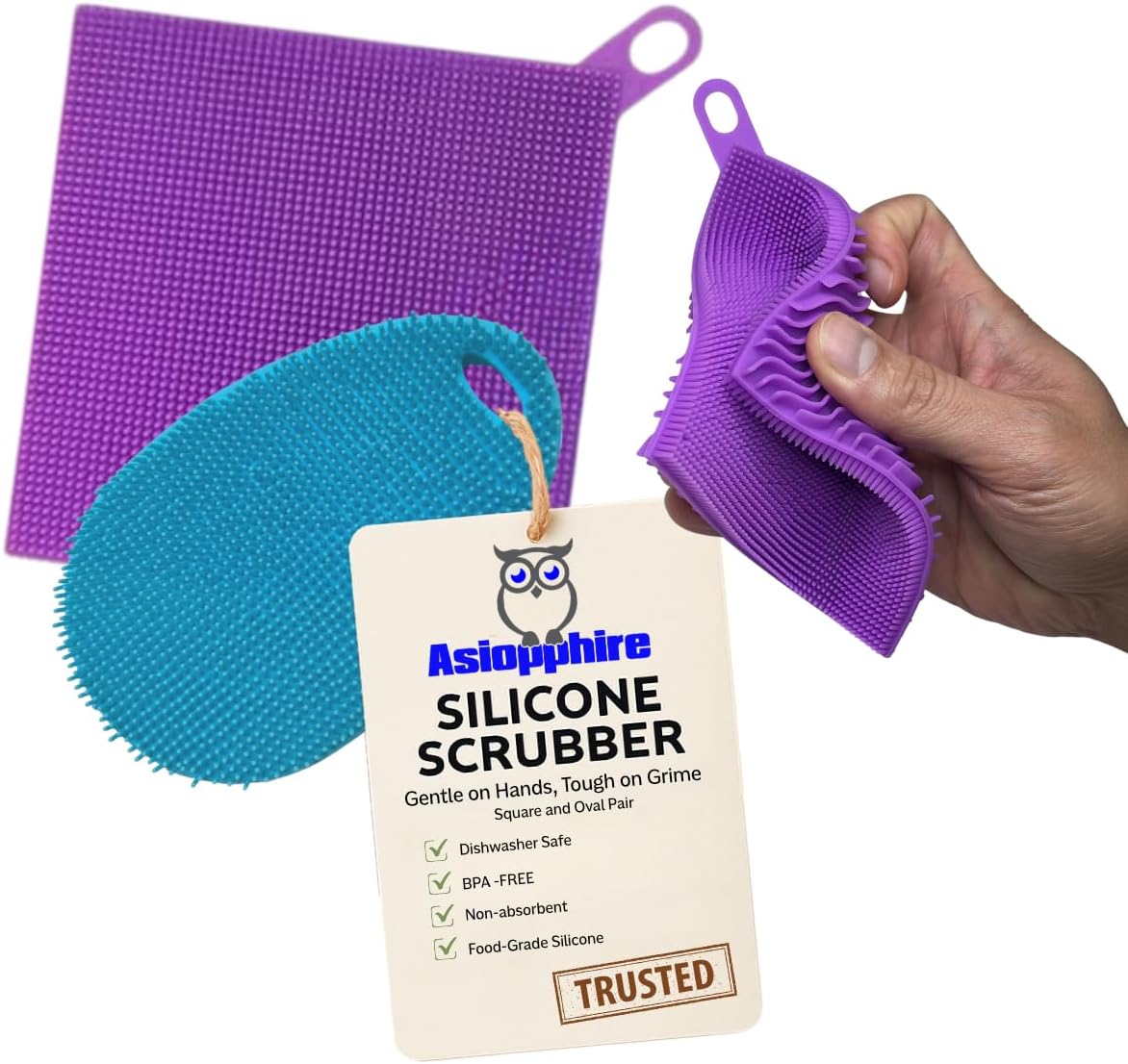 - At Asiopphire, we're committed to creating the durable, efficient home & dish washing accessories you need for a clean, sustainable home. We use our silicone scrubber dish sponges in our own home, testing for long-lasting quality and functionality. When our customers are happy, we're happy - which is why we back our silicone kitchen scrubbers for dishes with our customer happiness promise. If for any reason you don't love your sponge, we will make it right.