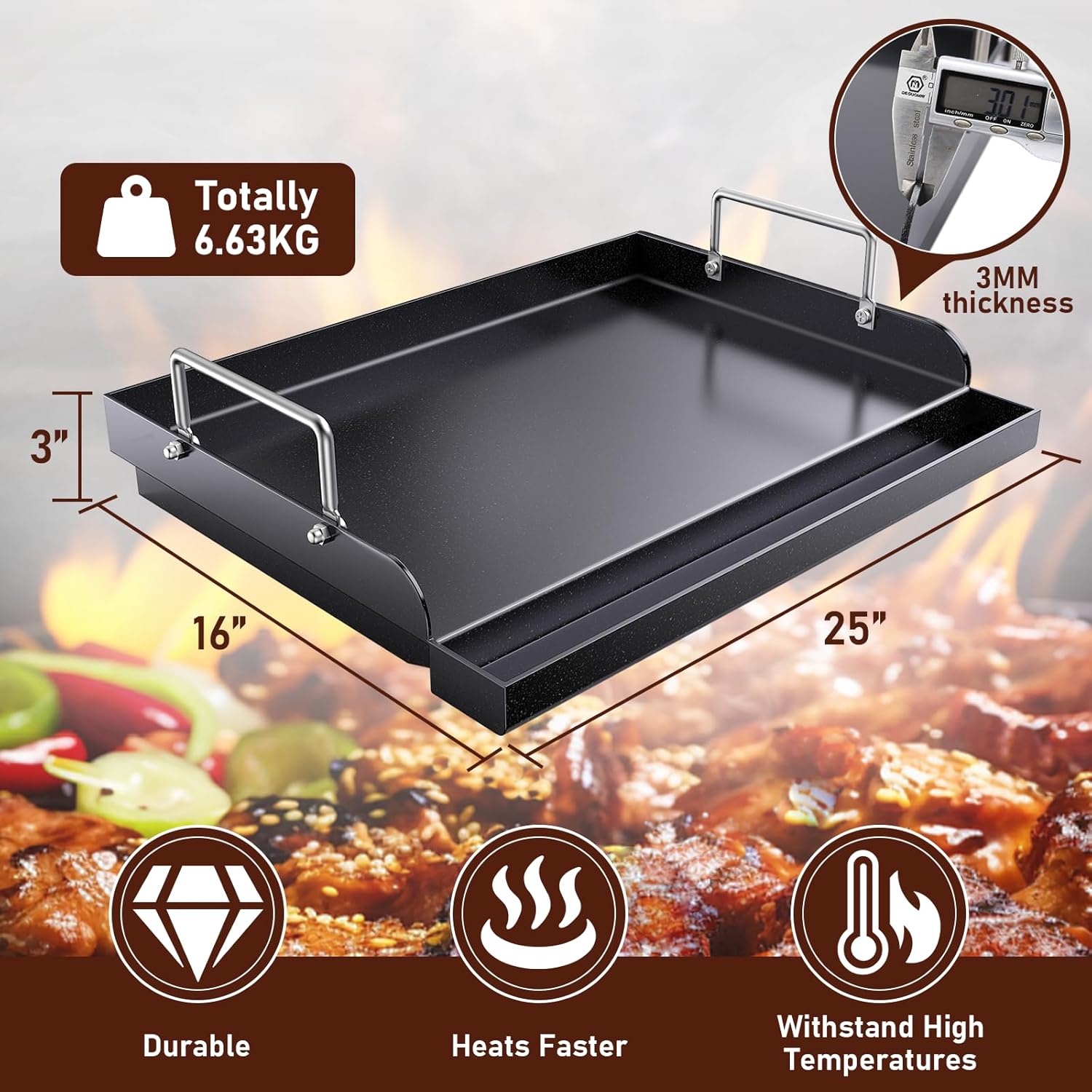 - 【Smart Design & Efficient Cooking】 The high-bar sides prevent food splashes and grease stains, while the sidewalls are ideal for flipping and turning food, keeping everything contained. The griddle's ventilation holes ensure even heat distribution, allowing for efficient cooking. Whether you're making breakfast pancakes or grilling steaks, this griddle ensures a flawless cooking experience