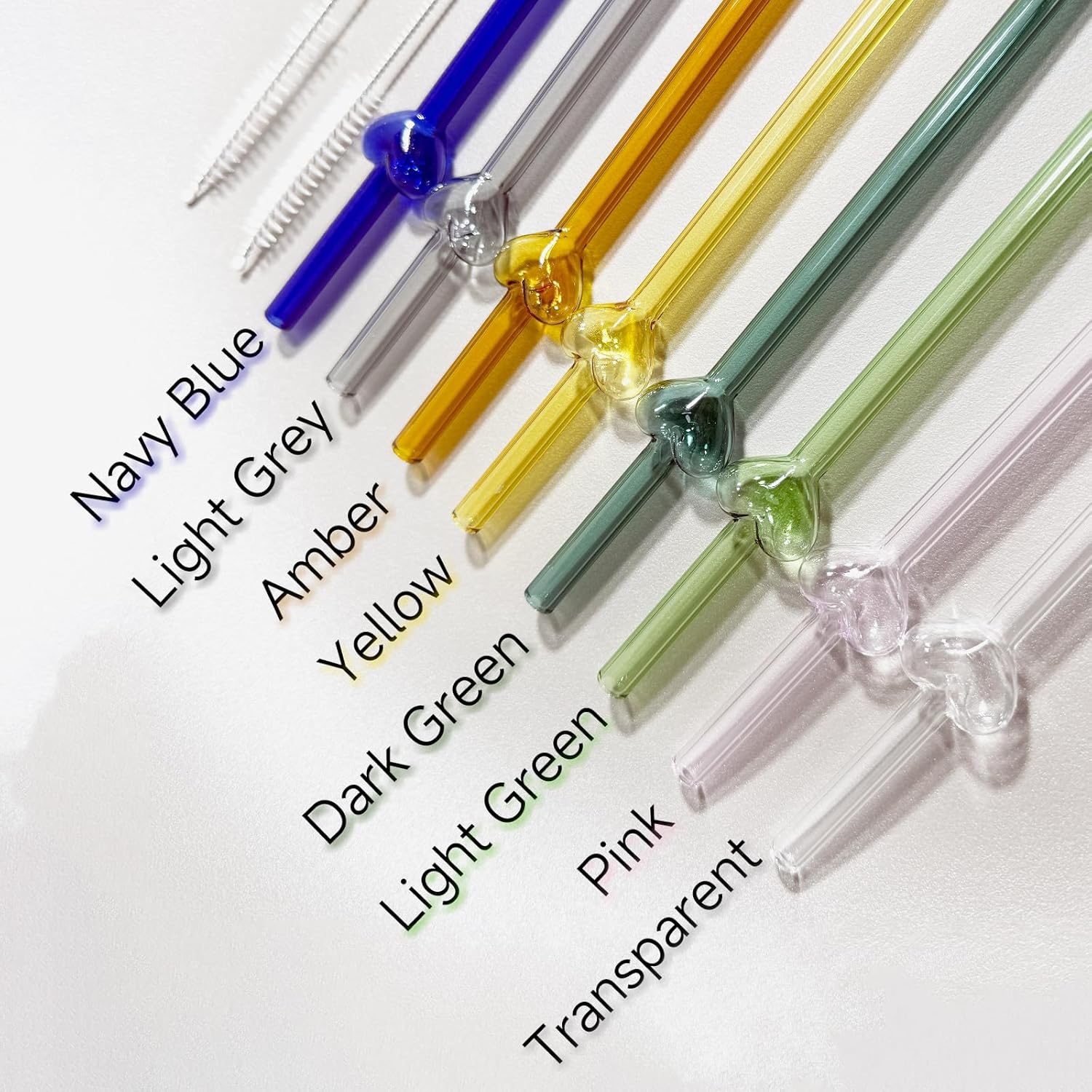 - HEART CHARM DECOR FOR THIS CUTE GLASS STRAW. Our collection is available in 8 vibrant colors hollow heart-shaped decoration straws. Our colorful straight glass drinking straws allowing for creative and colorful coordination with your favorite drinks and cups. These aesthetic reusable straws work great with all sorts of drinks – sodas, iced beverages, milkshakes, smoothies, water, coffee, milk and cocktails, you name it.