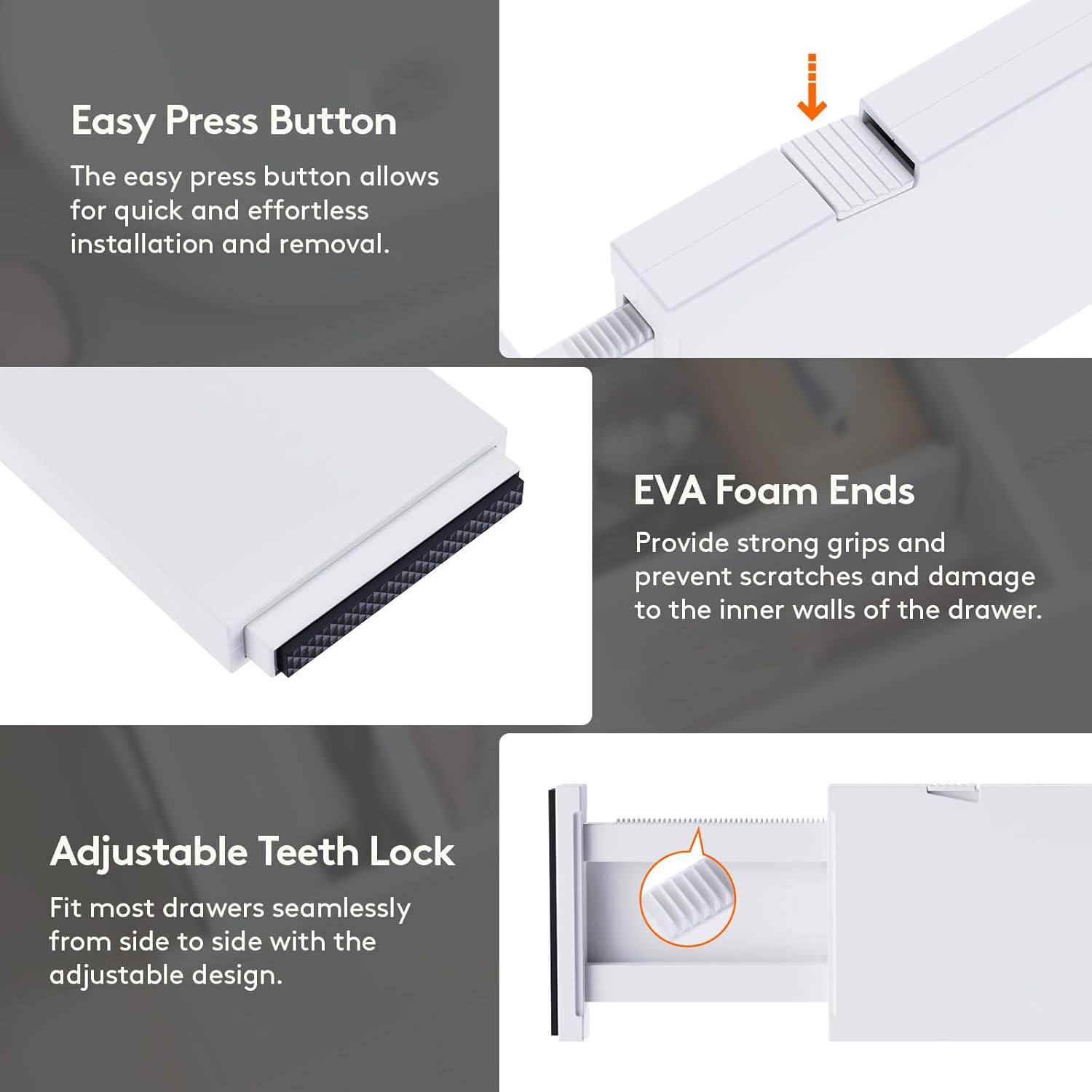 - Premium Material: Our drawer organizers for clothing are made of sturdy ABS material and include high-quality EVA foam sponges on both ends to prevent any scratches or damage to your drawer’s inner walls, leaving no trace or residue behind